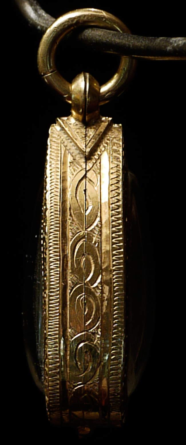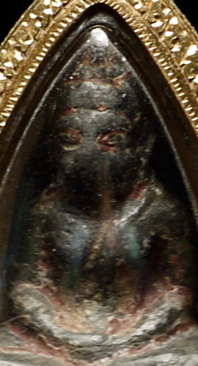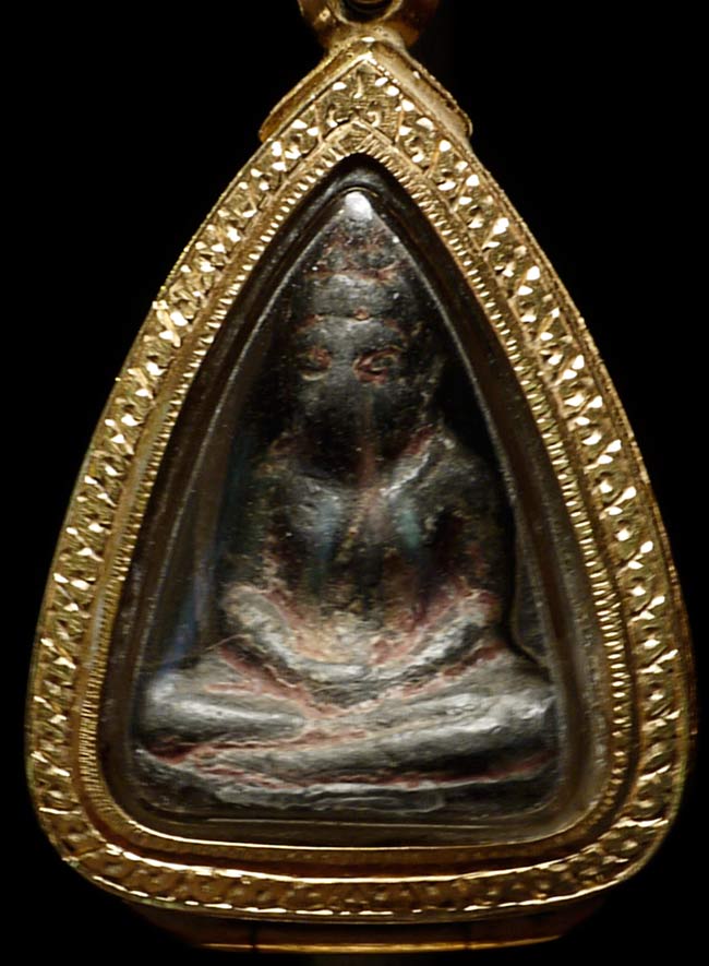 Chiang Sen Northern Thai 15th century amulet in a thick 22k amulet case. This was a gift many years ago from the grandson of the last sitting monarch of Lampang (now a city in Norther thailand- was a separate Kingdom until 100 years ago). It was from his grandfather's collection. I gave a donation to a museum of folf art he was opening in the Nothern Thai city of Chiang Rai. He appreciated my love for the Buddha and the donation, so he gave me this piece. I had the case custom made (close to half an ounce of 22k gold in the case). Case measures 1.25" x .75" .25" deep