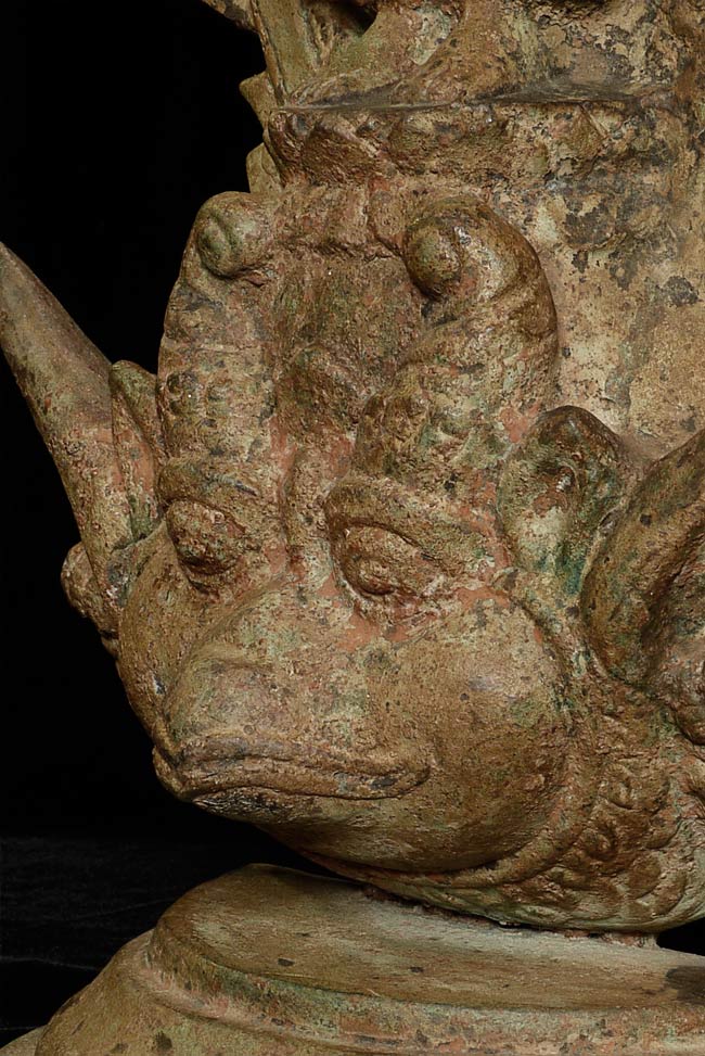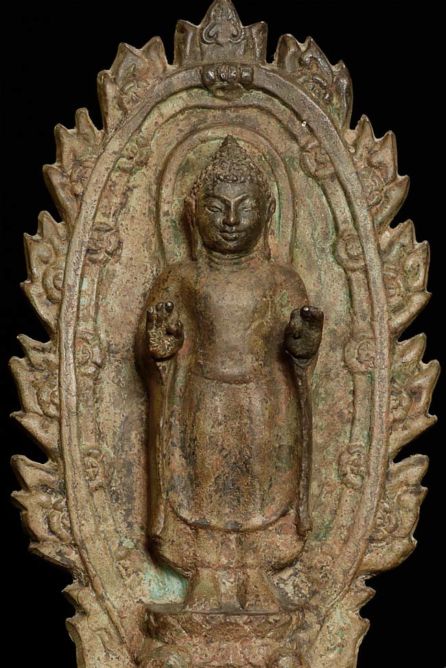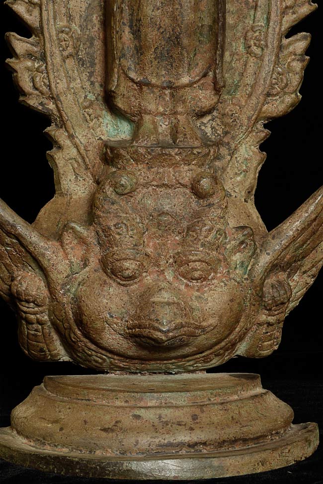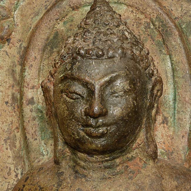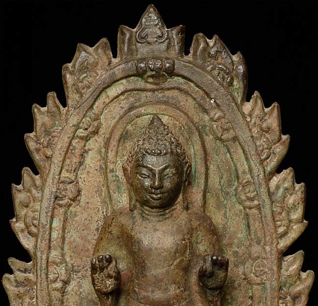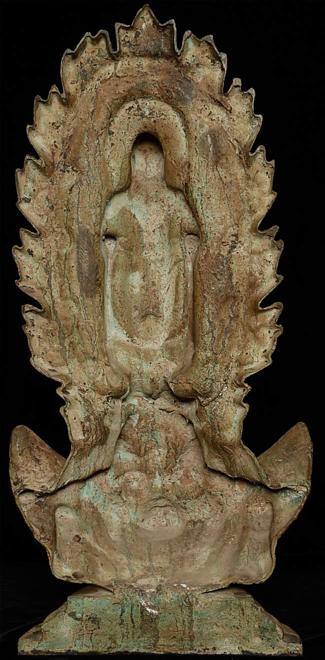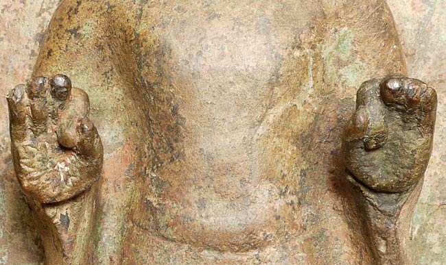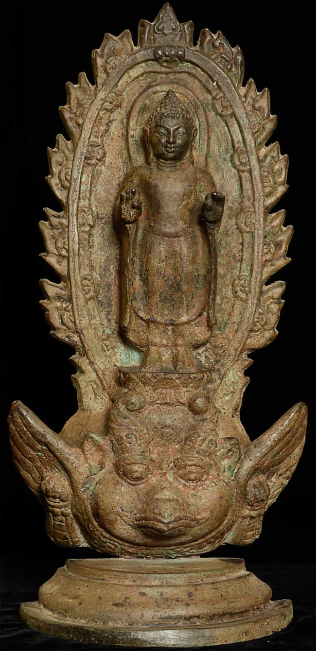 This vintage Dvarati style bronze Buddha is particularly large with its ancient qualities. The measurements are 20.25” tall, 10.5” at its widest point, and 5” deep.