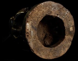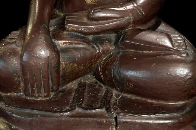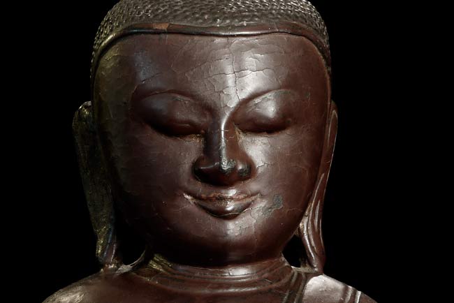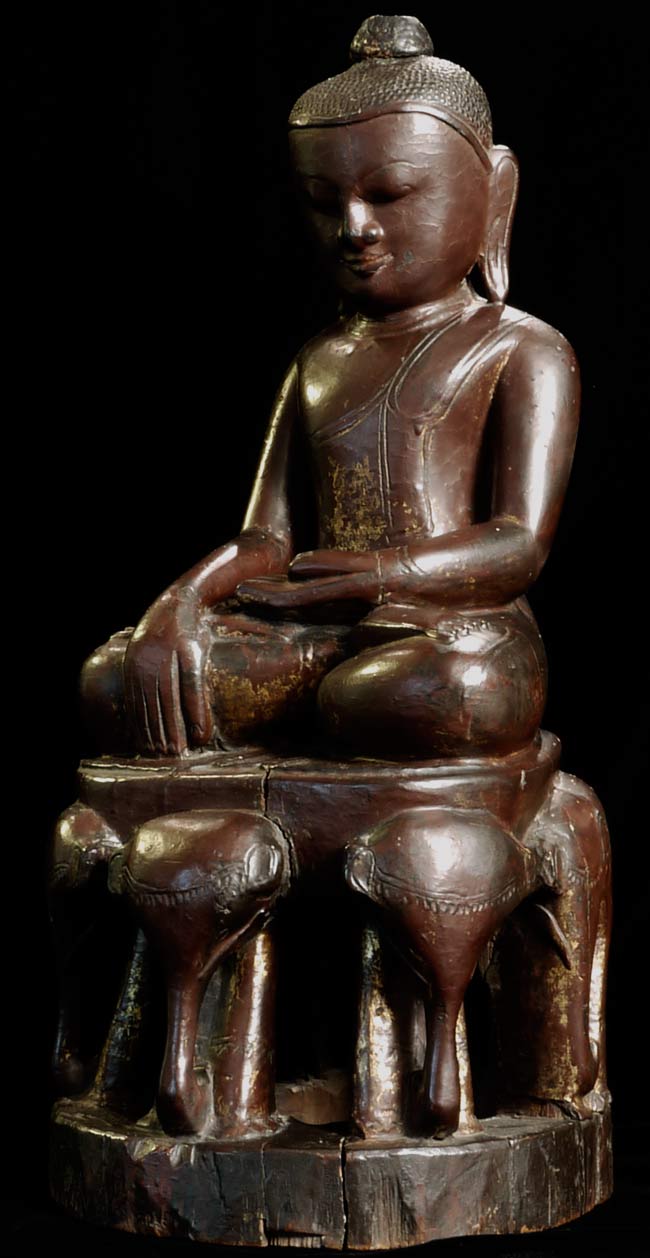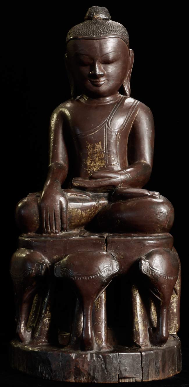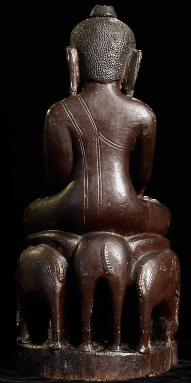 A remarkable large 16/17thC Ava style Buddha sits atop a circle of elephants. He has the round face with influence from the earlier Pagan period. In excellent condition- top of finial is missing- otherwise near perfect. Carved out of one solid piece of teak. I've not seen another of this type in this quality, size, age and condition. Measures 7.25" tall with a diameter of 8.75". Wonderful
