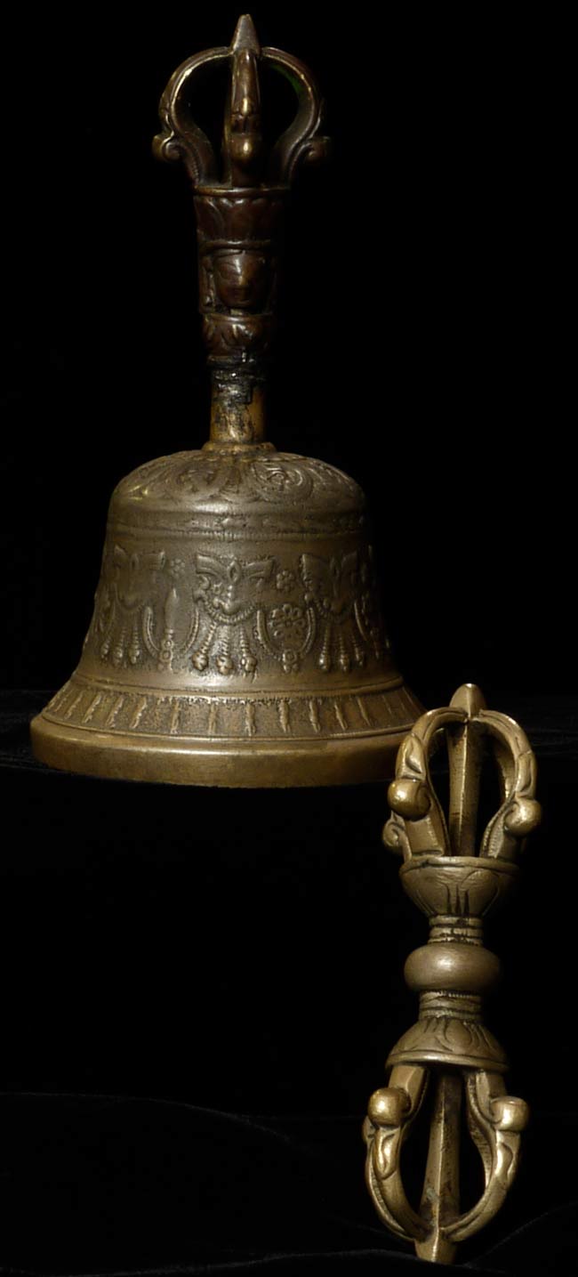 Antique Mongolian or Tibetan Bell and dorge. Bell stands 5.75" tall and has a lovely tone. Dorge is 4.5" long.