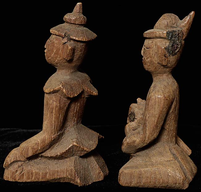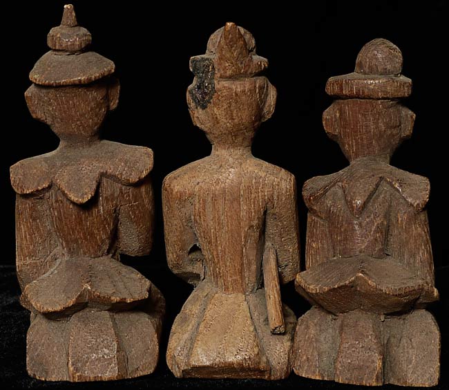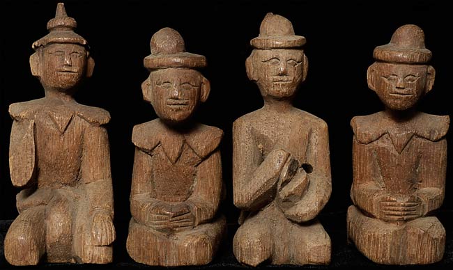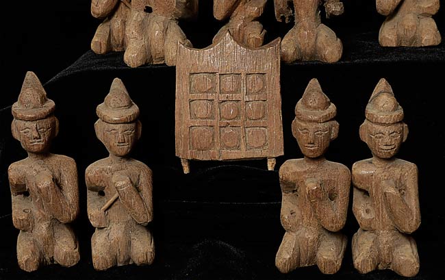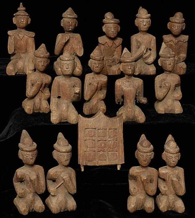 Set of 14 old wooden Burmese Monks figures and shield. Pieces are 3" tall.