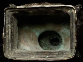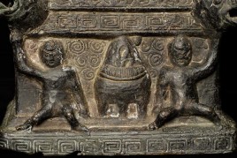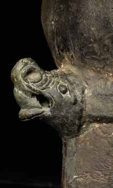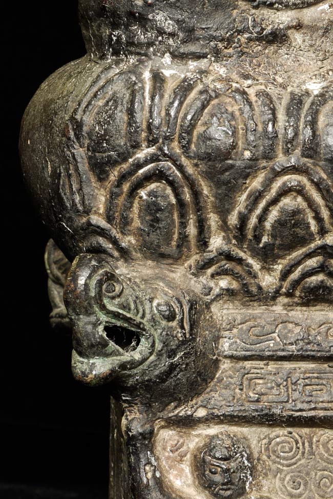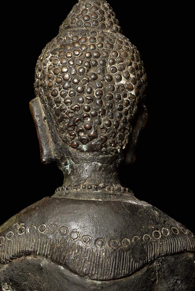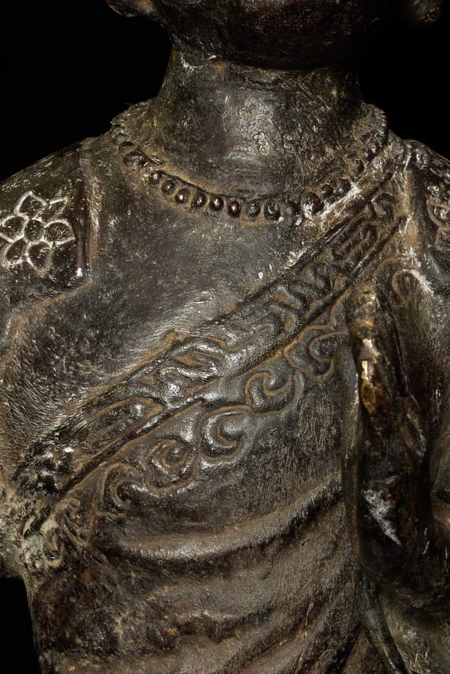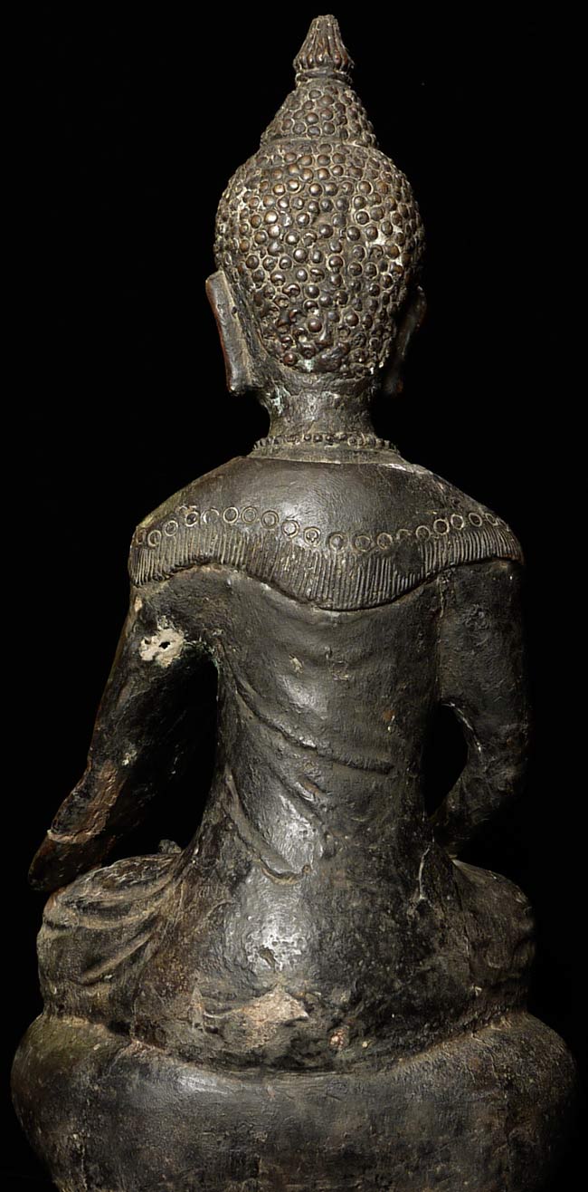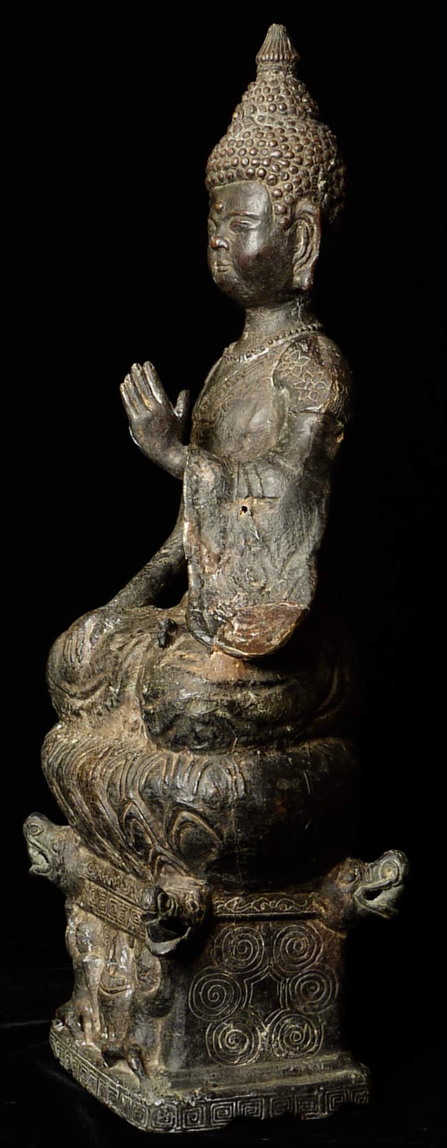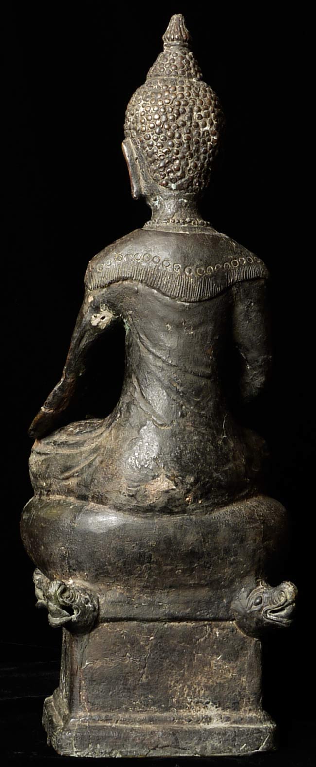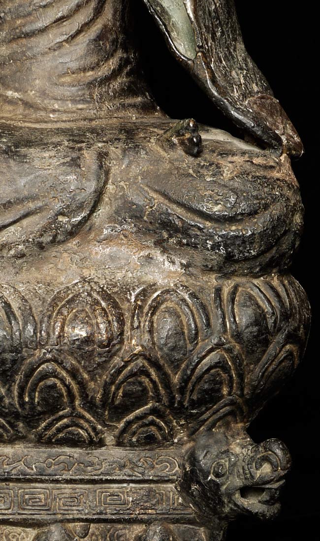 Unique 18thC Southern China (Yunnan) Buddha with S.E. Asian influence. Note the 4 Nagas on the base in addition to the unusual figures on the front of the base. You are unlikely to ever see another like it- first of this type I have seen in this large size. Sits an impressive 19" tall, base is 4.5" x 6". Delightful detail to the surface- stylized flowers on the robes and spirals on the sides of the base.