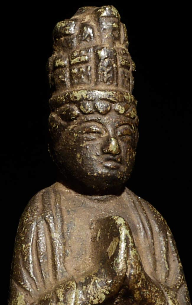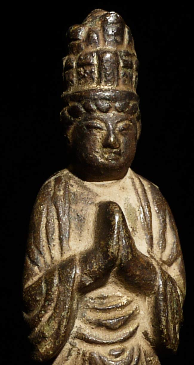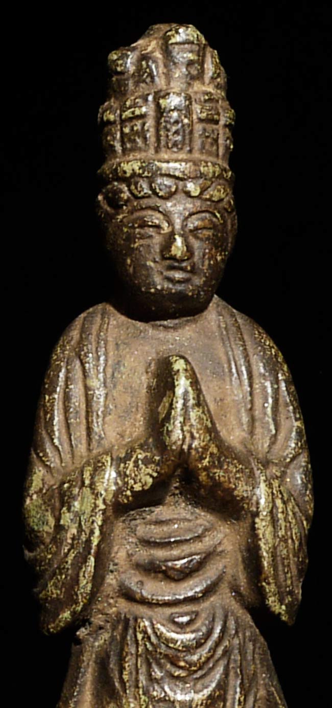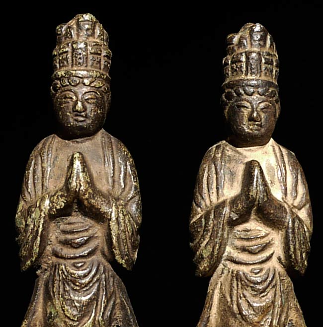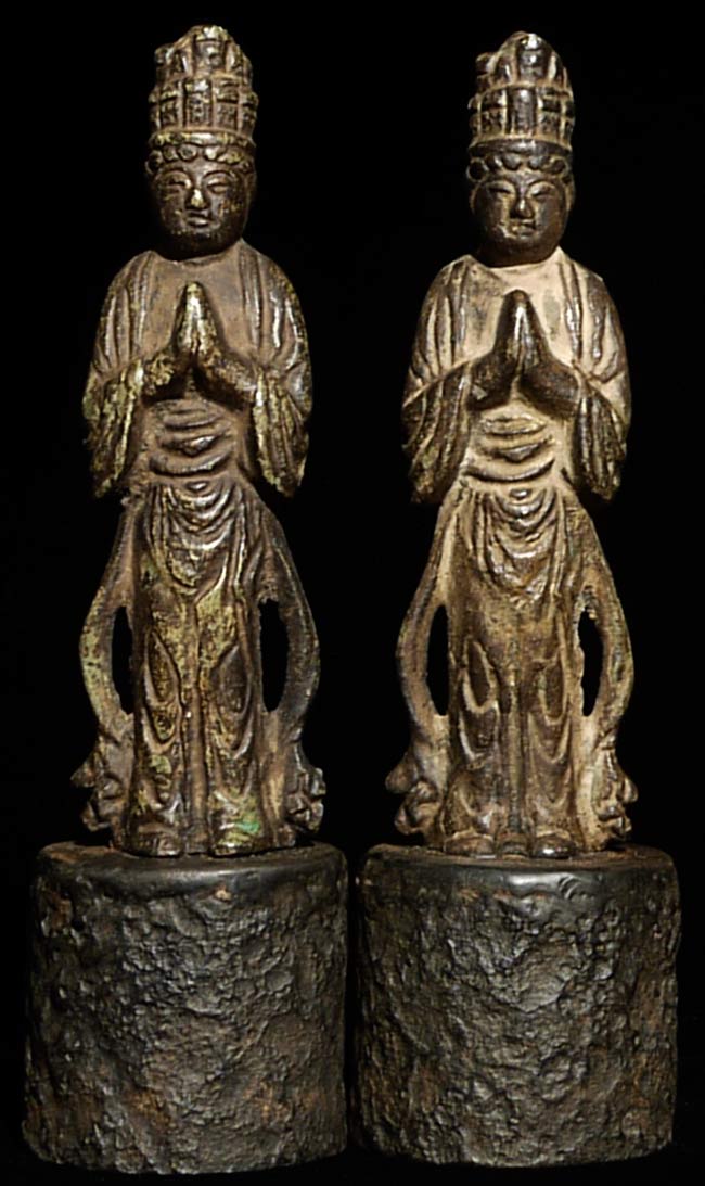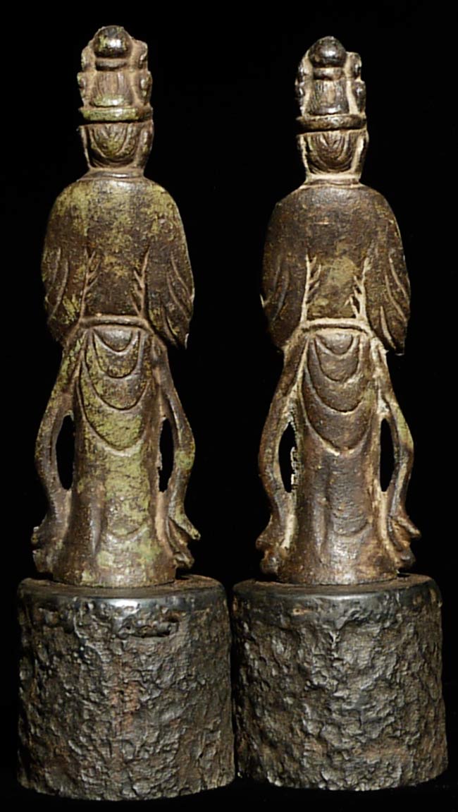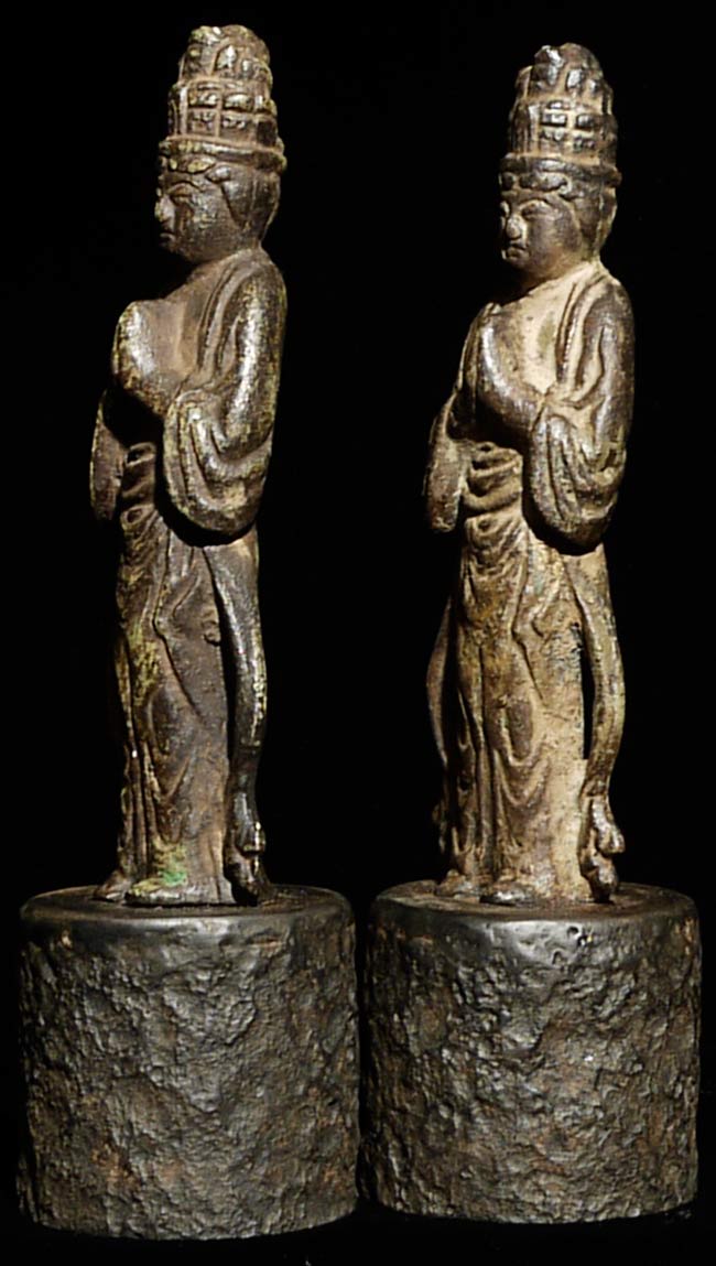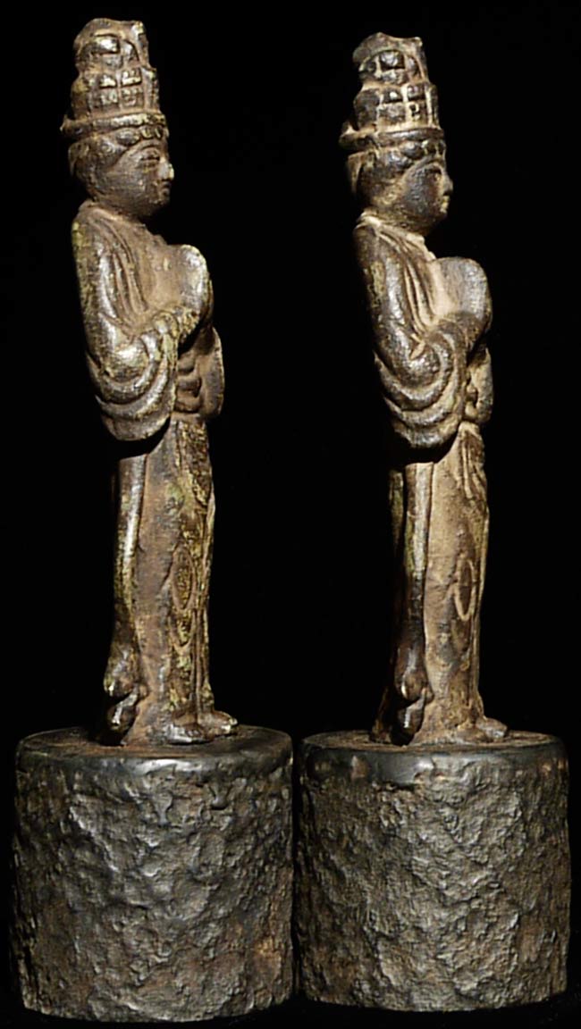Rare Pair of antique Japanese Bodhisattvas. Purchased 15 years apart, these were almost certainly cast in the same foundry. I had matching custom bases made at considerable cost. Each stands 5.5" tall including the base , diameter of base is 1.5". Price is for both.