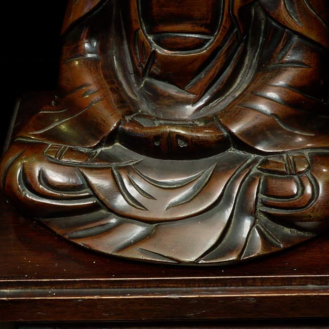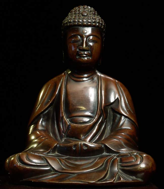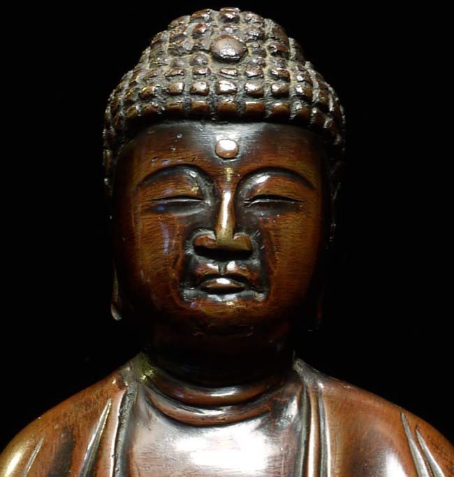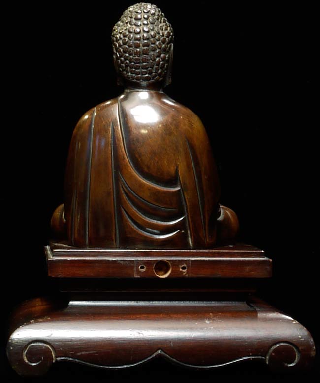 Antique Japanese Buddha attached to an old lamp base is 5.75" tall, sitting atop a base that is 3 1/8" tall for a total height of 8 7/8". Bottom of base measures 7 .25" x 5 5/8"