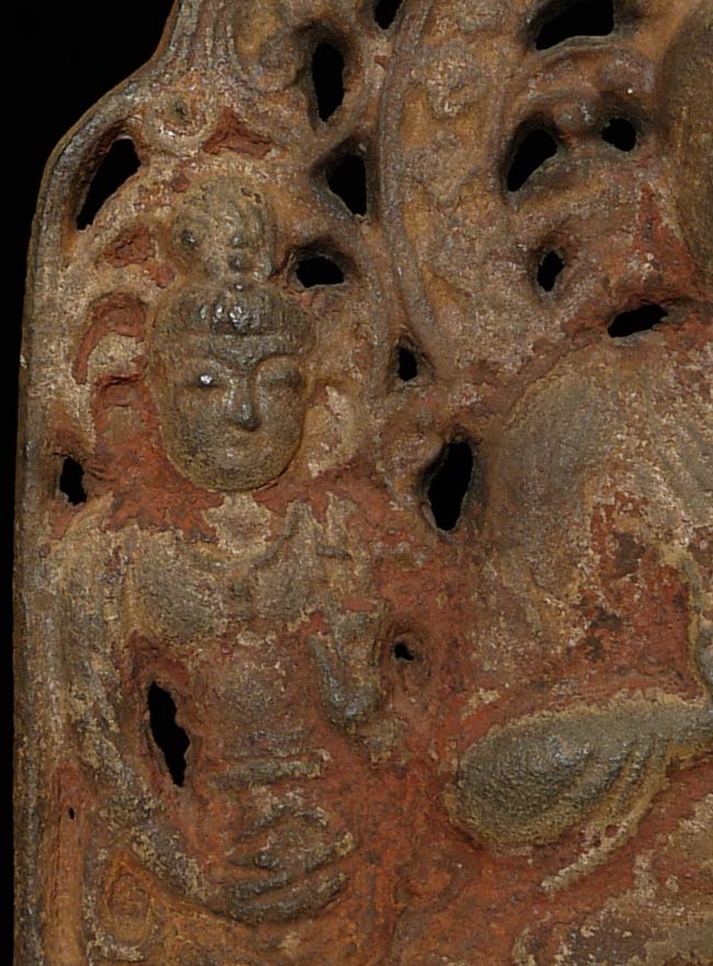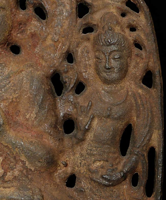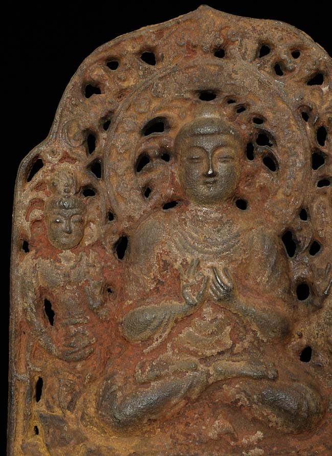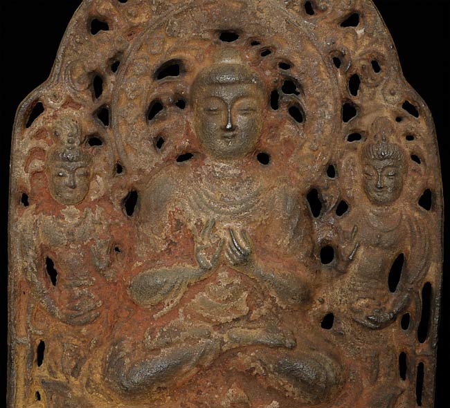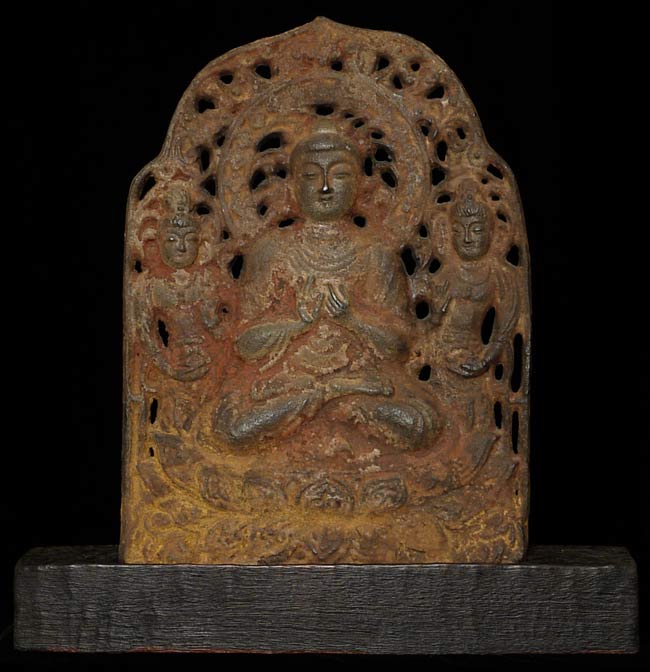 Chinese Iron Buddha Plaque. It measures about 11 1/2" high and 8 1/4" wide and sits on a custom base that is 1.75" tall, 12.25" wide, and 1.75" deep.In the book "Transmitting the Forms of Divinity, Early Buddhist Art from Korea and Japan" put out by the Japan Society in 2003. It contains a 7/8thC bronze cast dead ringer for this piece on the cover. I am unsure that mine is a period piece, but the text describes "similar Chinese and Japanese triad plaques were produced by hammering a sheet of bronze against a mold" - it is possible that this one is one of the early hammered examples.
