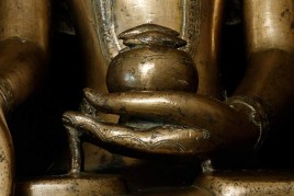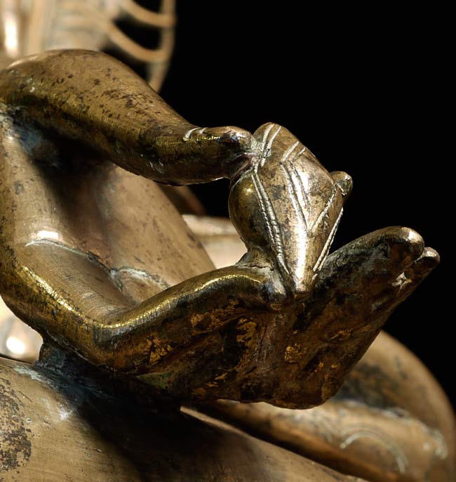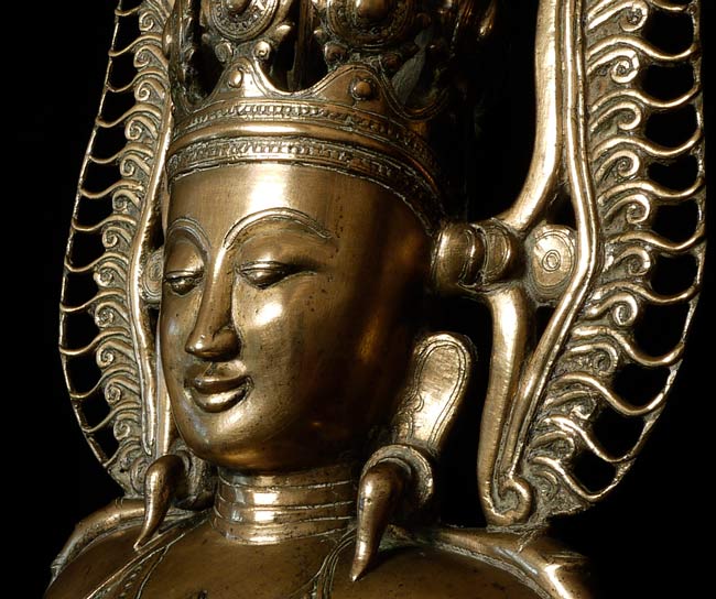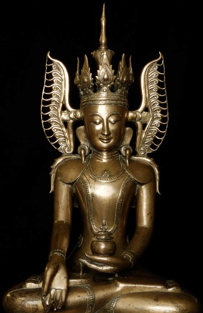Striking and radient, this is a wonderfully sculpted 17/18thC Arakan Style Royal Bronze Buddha. Study the photos- you are unlilkey to ecounter one of this type, age, size, quality and presence any time soon. 20.75" tall, 13" wide, 8" deep. Beautiful patina with traces or original lacquer. Near perfect condition, with appropriate wear. Nothing is missing, damaged, or repaired save the original high stepped base. Much larger than its dimensions suggest. I have put a 5 inch and an 8 inch Buddha in several photos to give a sense of how large this is. Expensive