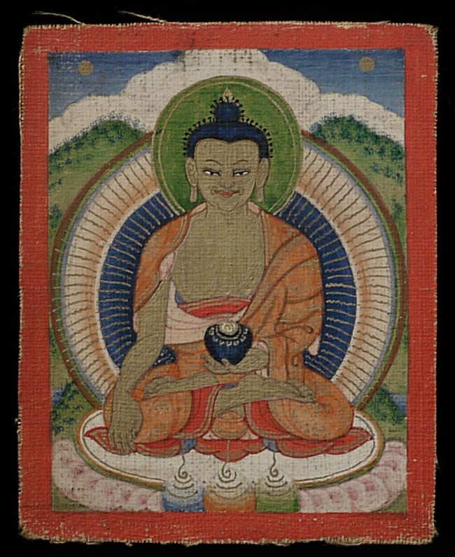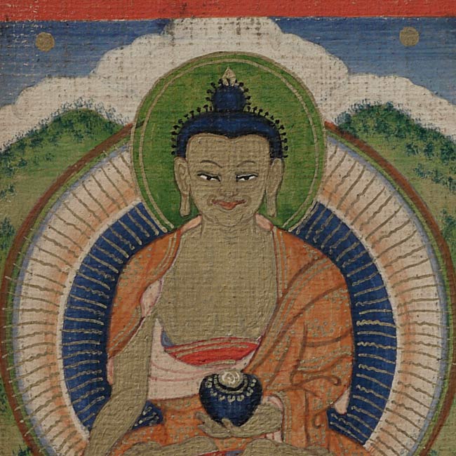 Particularly nice antique miniature Mongolian thangka measures 2.5" x 2". Fantastic face!