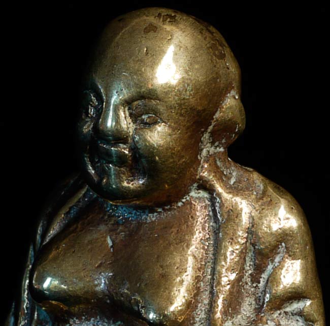 19thC Solid Cast Chinese Hotai. Extensive wear from rubbing for good luck!1.75" tall, bottom measures 1.75" x 1 5/8"