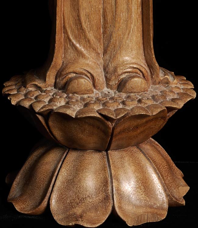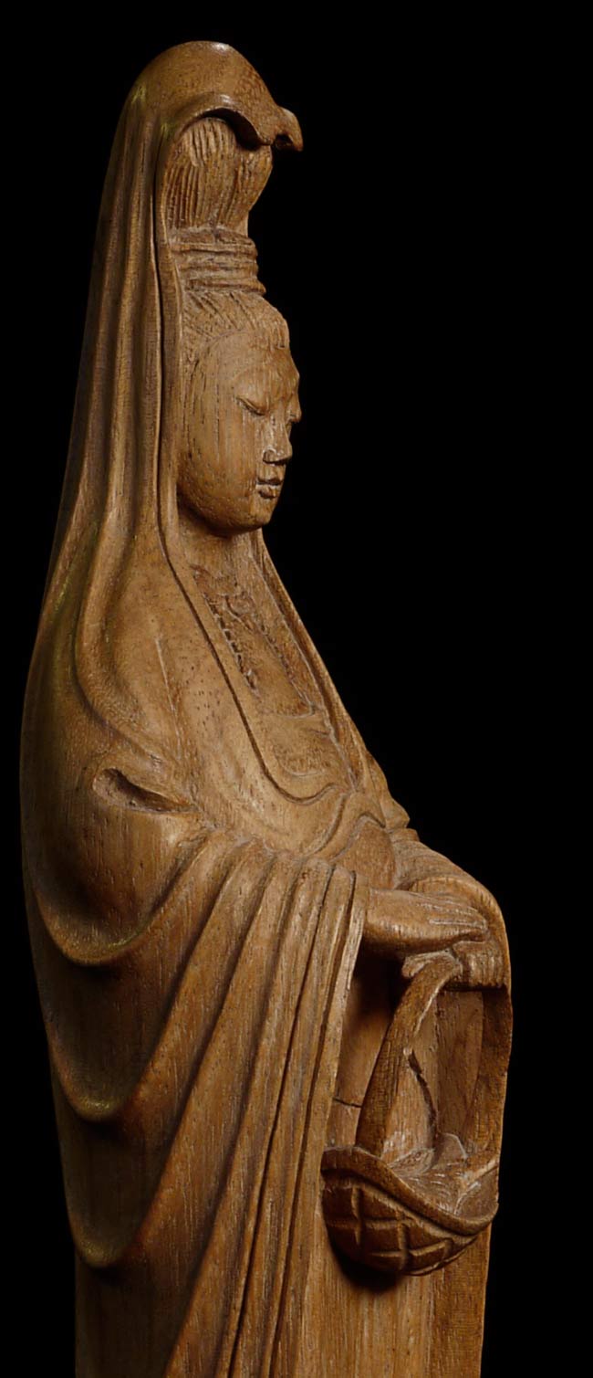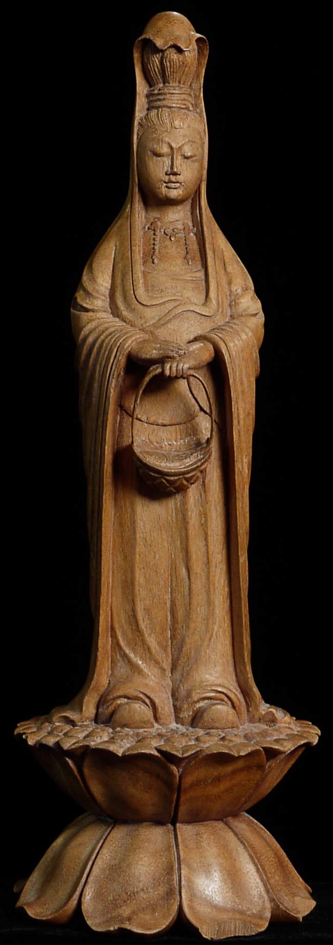 Wonderful vintage wooden Quan Yin standing on a lotus pod carrying a fish in her basket. 16" tall, base has a diameter of 5.5"