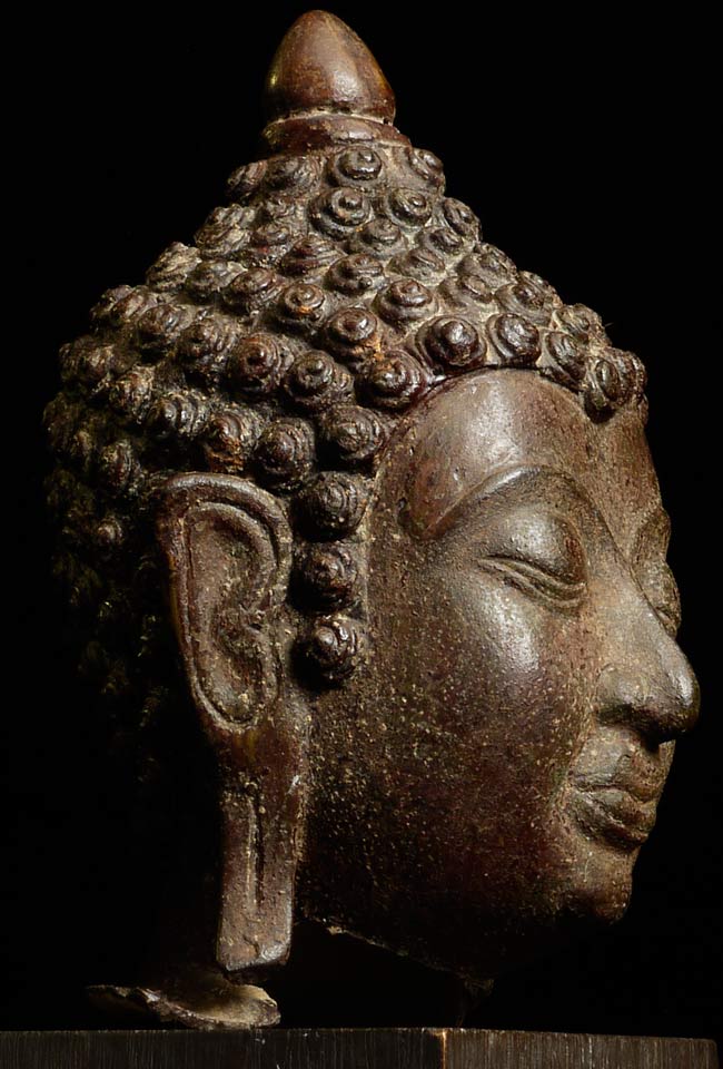 Old Thai Bronze Buddha Head sits 7" tall, sitting on a wooden base that adds another 4.5". Style is 15thC, though probably closer to 100 years old. Bottom of base measures 4" x 3.5"