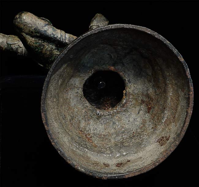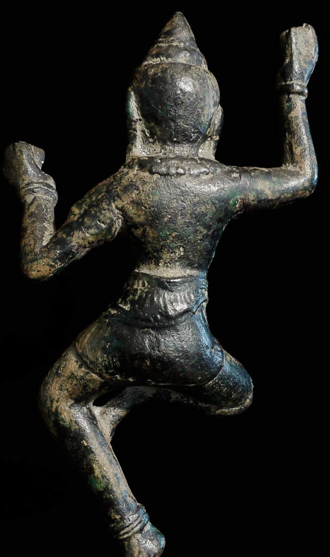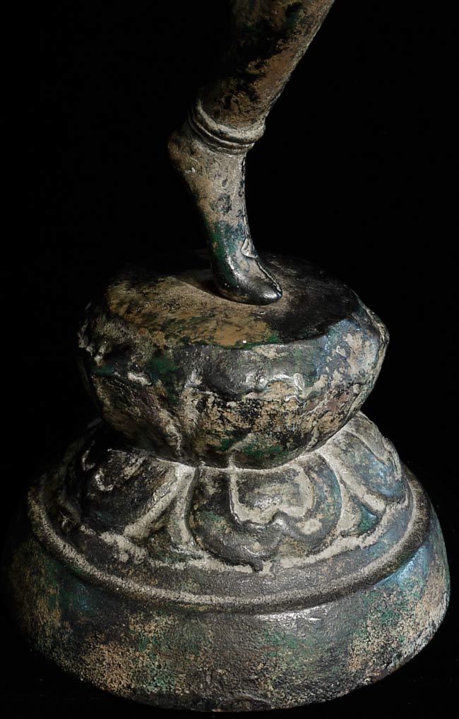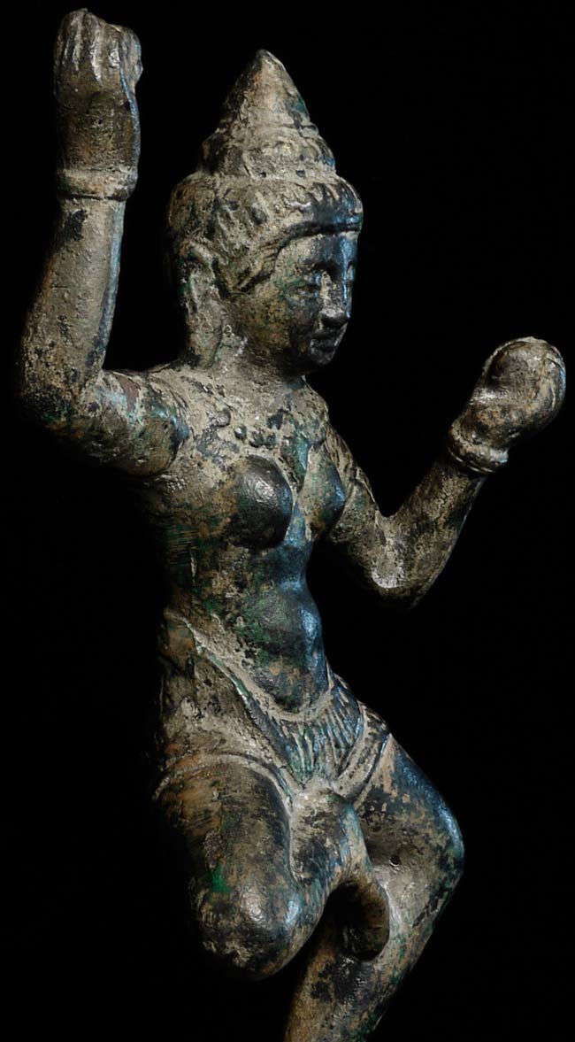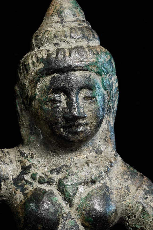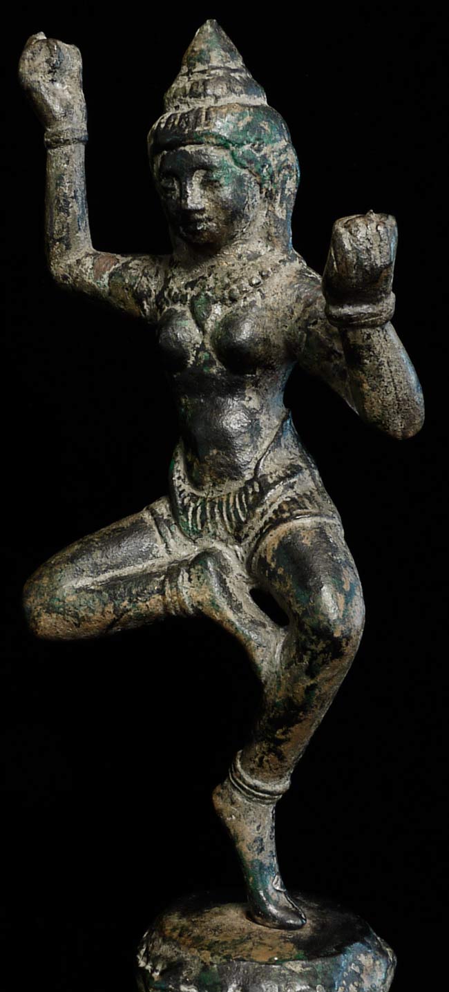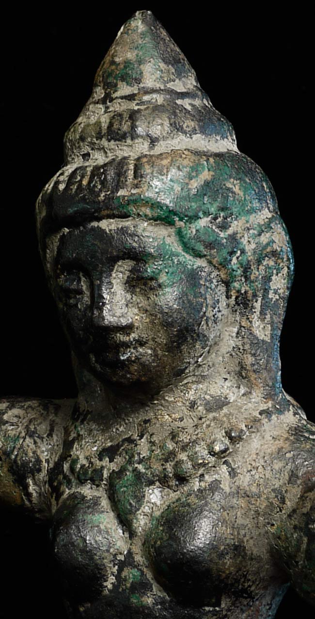 Quite large solid cast bronze Khmer Apsara stands 12.25" tall and has a diameter of 4.25". Considerable wear, though face is and overall feel are still wonderful. This is an authentic one. Rare to find complete in this size.