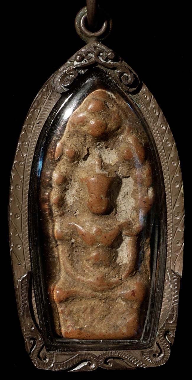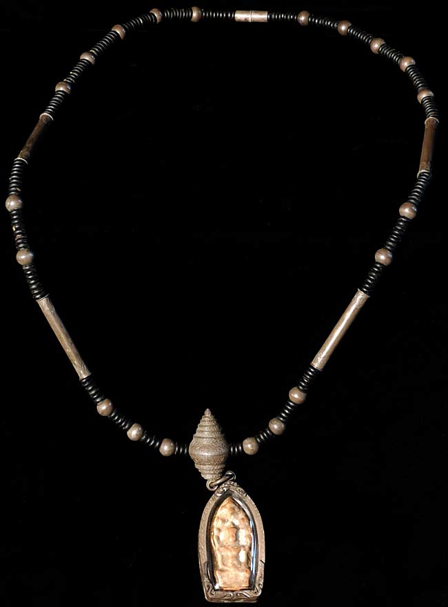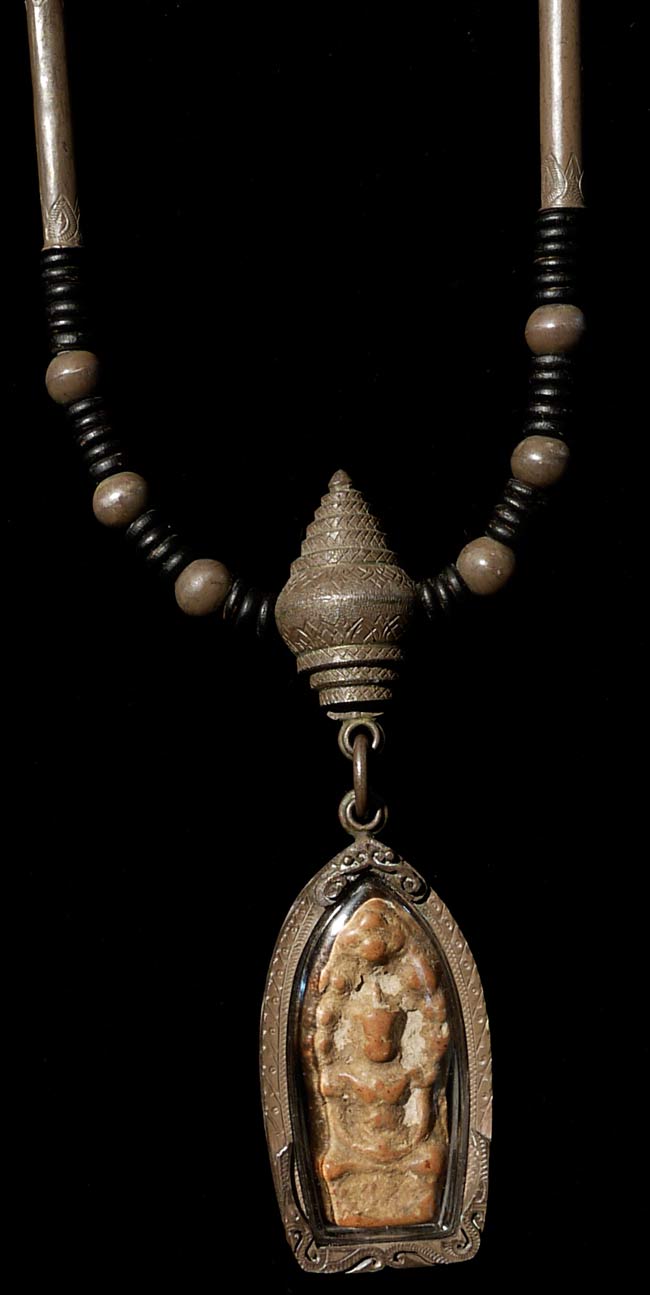 Authentic terracotta 12-15th century Cambodian or Thai Naga Buddha amulet in modern silver frame WITH antique silver and bead Thai amulet necklace. Diameter of 11", amulet case is 2" tall. Fine and rare example of its type.