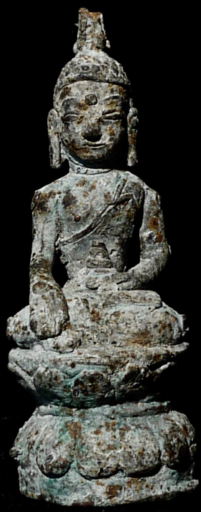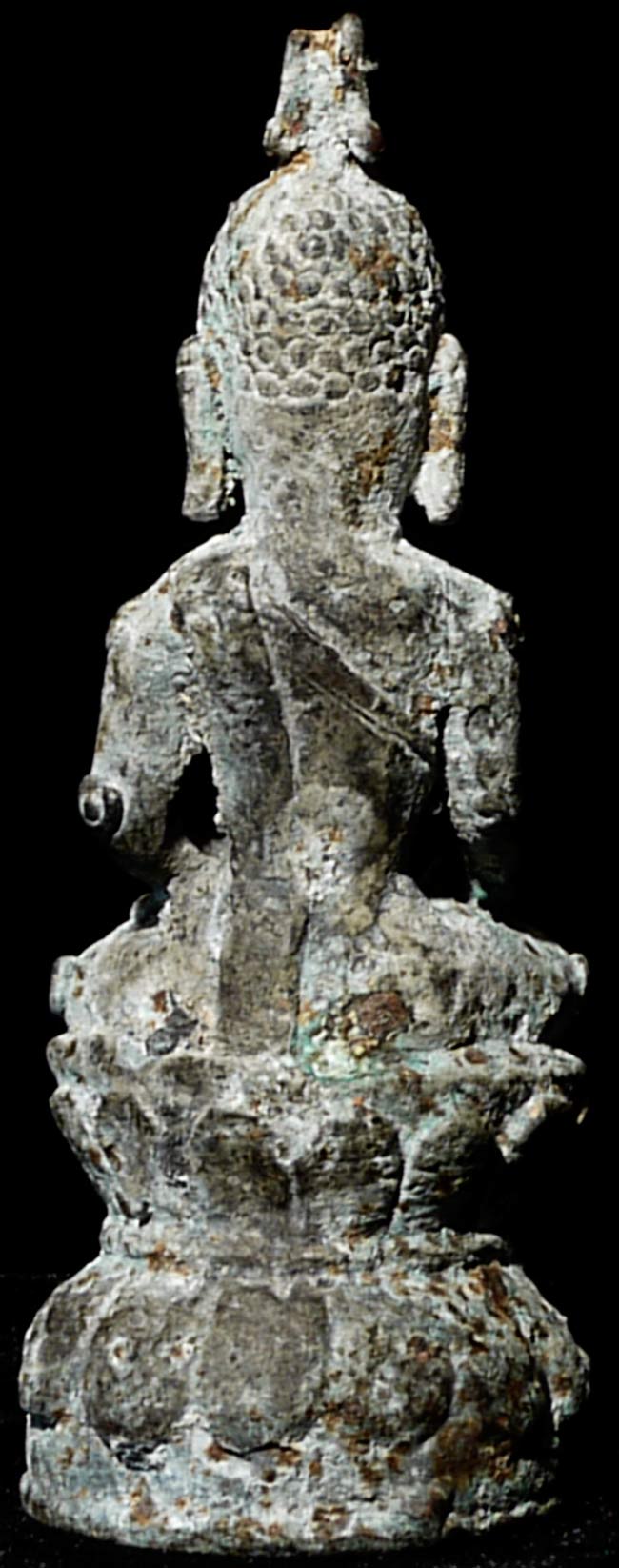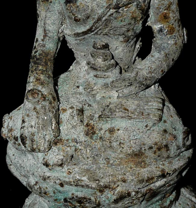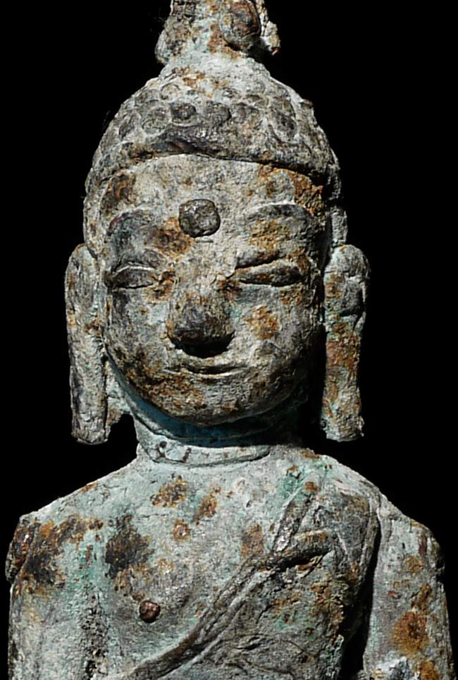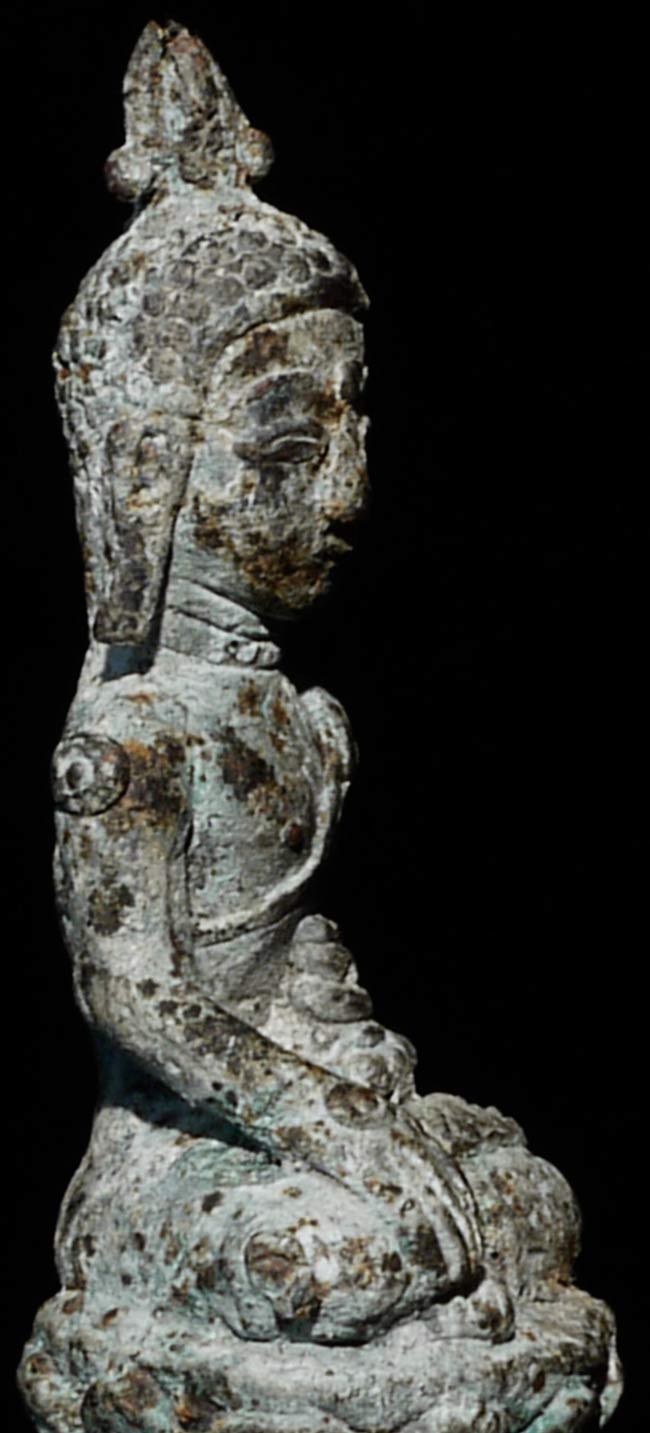Uncommon 17thC (or possibly much earlier) Burmese Bronze Buddha. Appears to have been through a fire long ago. The snail curls on the shoulders, elbows, etc. are a Burmese feature considered to provide good fortune. Measures 3.75" tall, bottom has a diameter of 1.25".
