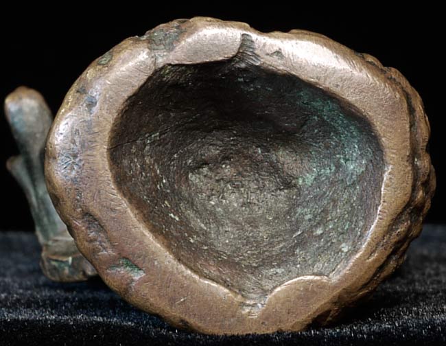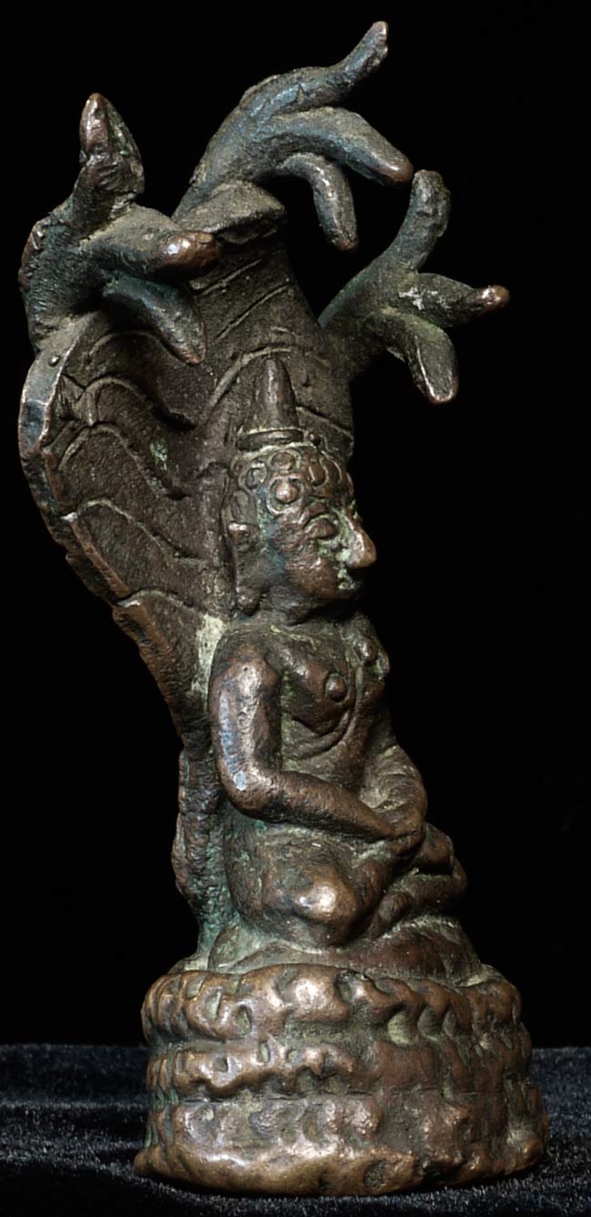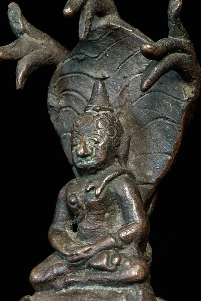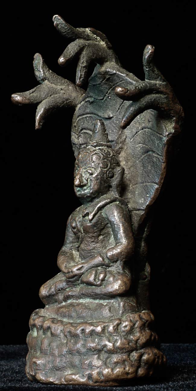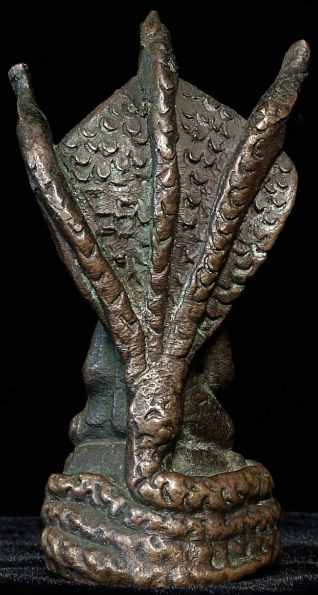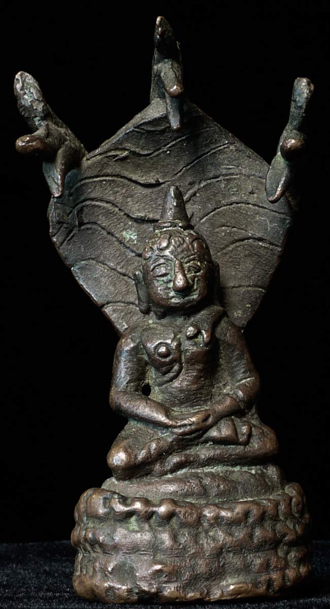 Antique small folk-style bronze Naga Buddha. Great personality! Could be Lao, Cambodian, or Northern Thai. 3" tall, widest point is 1.5", 1" deep
