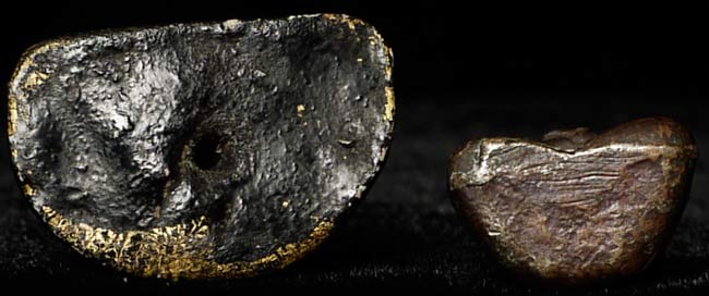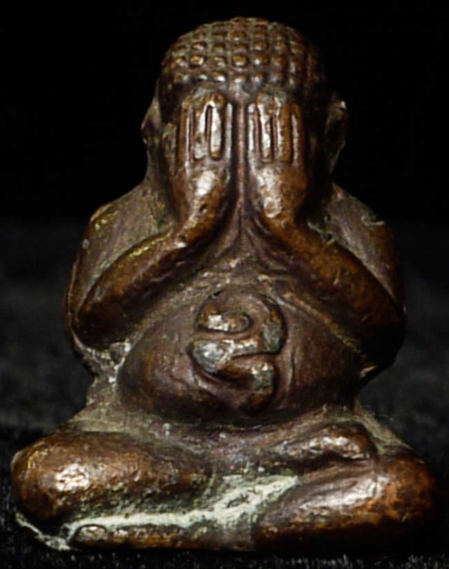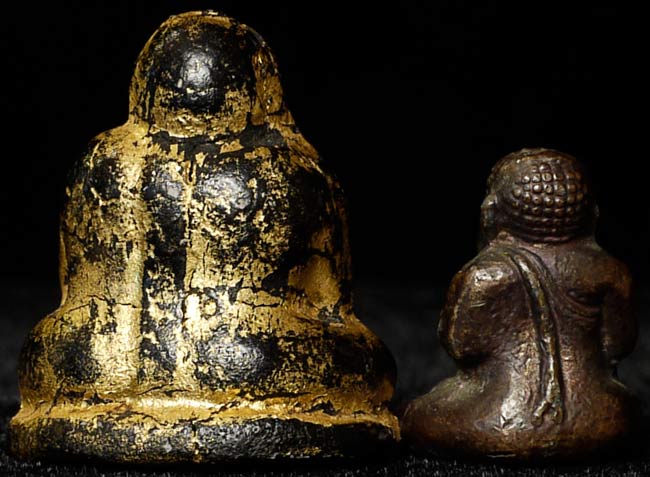 Two "Pra Pita" from Thailand. Gilded lacquer figure is 19th or earlier. The smaller bronze piece is probably mid-20th century. They are being sold together. Taller piece is 1" tall, smaller piece is .75"
