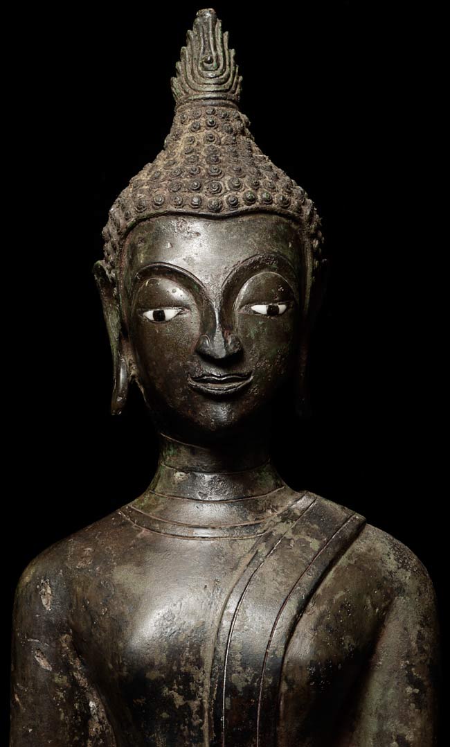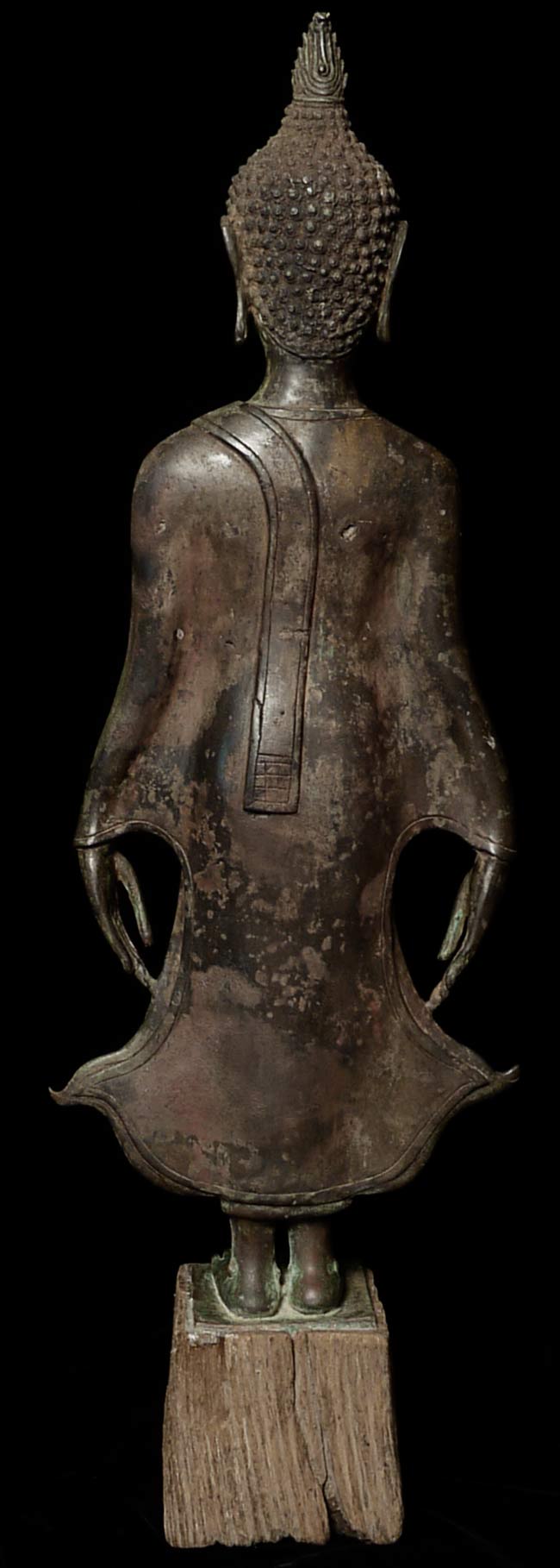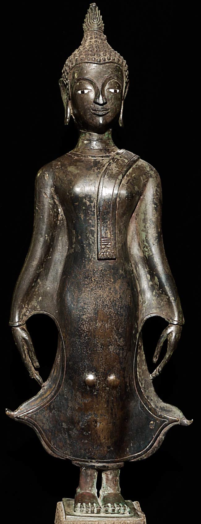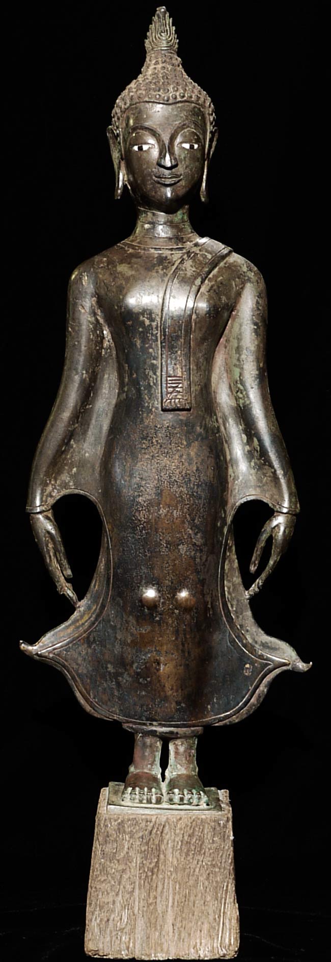 SUPERB large 16th century Northern Thai/Laos solid-cast standing Buddha. In the very distinctive Lanchang style, which is from an ancient kingdom which spanned parts of current Northern Thailand and Laos. This style of standing Buddha is quite rare to find in bronze from this early period-especially of this quality, condition, and size. I've never seen one for sale before. The vast majority of this style are much later, and made of wood. Note the finesse in the hands, the delicacy of the finial, and the sensitively modeled face. The eyes are quite old- may be original. There are traces of black lacquer and gilding in the hair as well as in a few other spots. 19.5" tall, and is attached to a wooden base that is 3.5" tall x 3.75" square for a total of 23 inches tall. Appox 20 pounds. Very special.