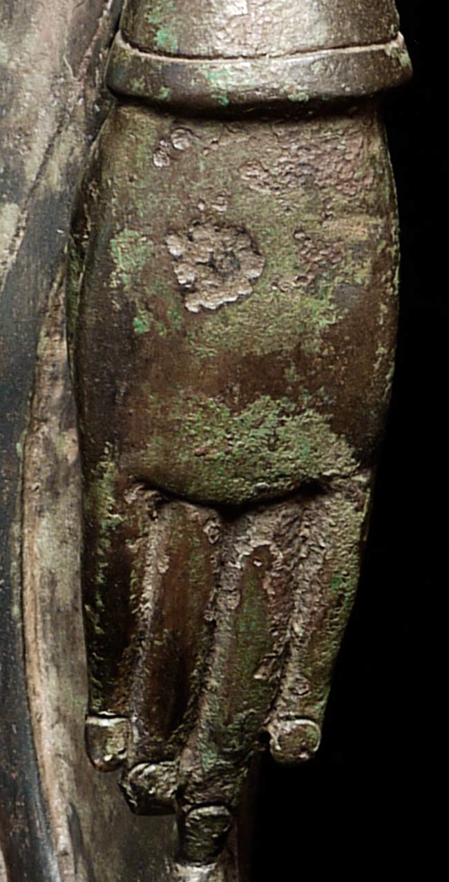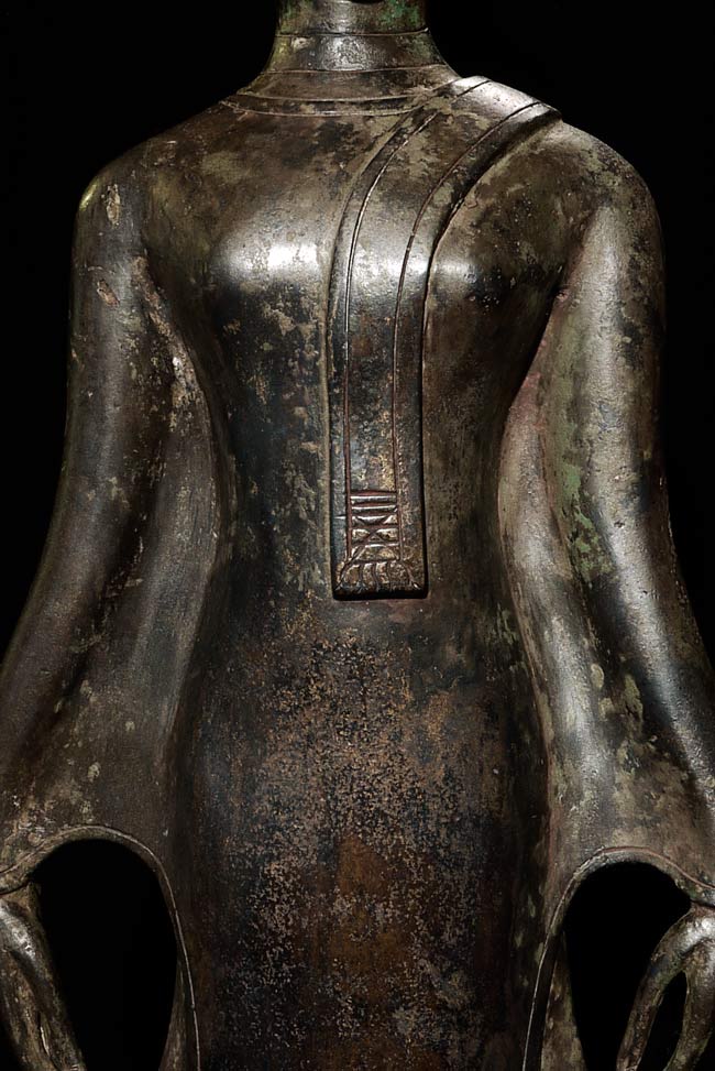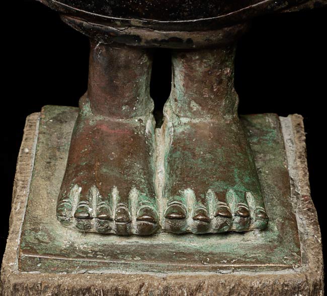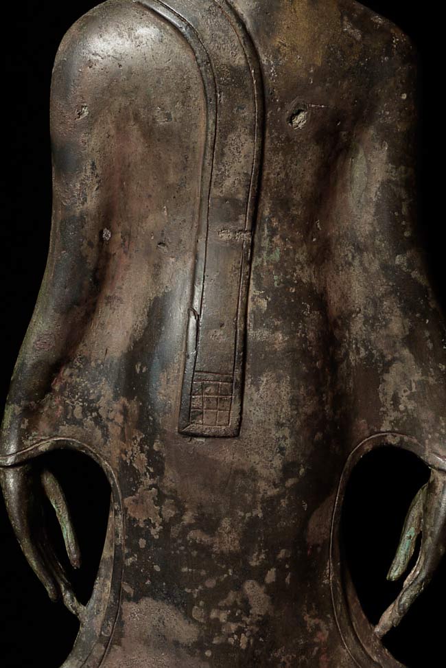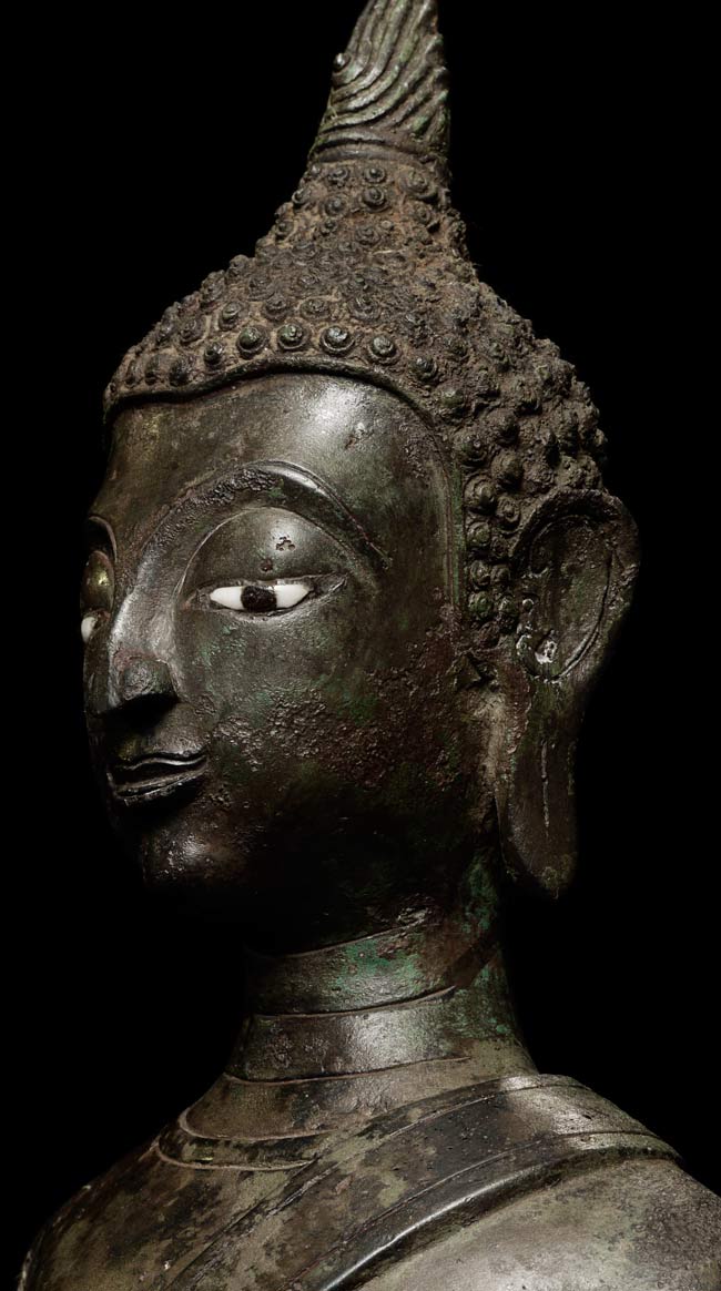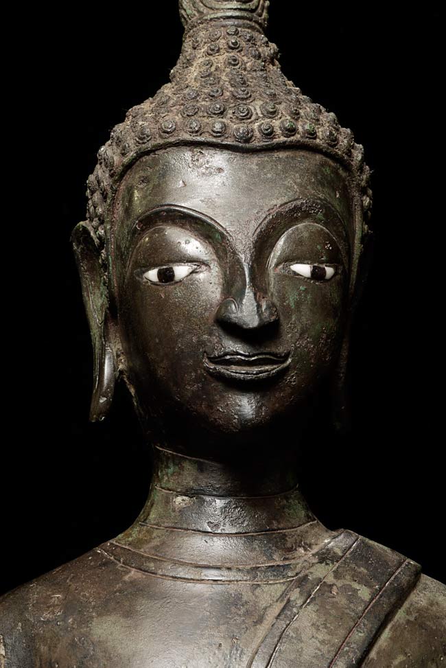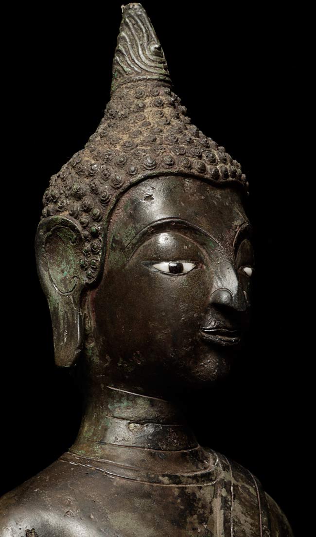 SUPERB large 16th century Northern Thai/Laos solid-cast standing Buddha. In the very distinctive Lanchang style, which is from an ancient kingdom which spanned parts of current Northern Thailand and Laos. This style of standing Buddha is quite rare to find in bronze from this early period-especially of this quality, condition, and size. I've never seen one for sale before. The vast majority of this style are much later, and made of wood. Note the finesse in the hands, the delicacy of the finial, and the sensitively modeled face. The eyes are quite old- may be original. There are traces of black lacquer and gilding in the hair as well as in a few other spots. 19.5" tall, and is attached to a wooden base that is 3.5" tall x 3.75" square for a total of 23 inches tall. Appox 20 pounds. Very special.