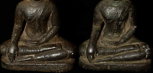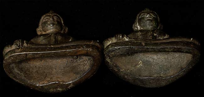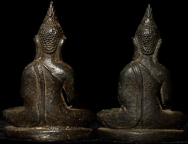 Set of 2 antique bronze near miniature Buddhas. Beautifully sculpted. Purchased together nearly 20 years ago. These 2 pieces are 2" tall, with bottoms that measure 1.25" x .75"