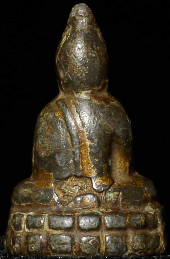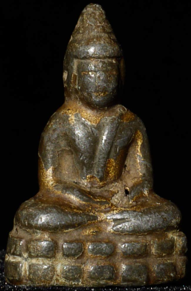 15/16thC Lead/Silver Alloy Solid-Cast Thai Buddha. Remains of rich gilding. Small at 1.25" tall, bottom measures 7/8" x .5"