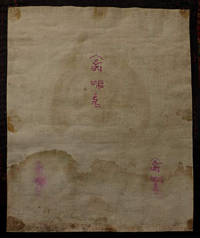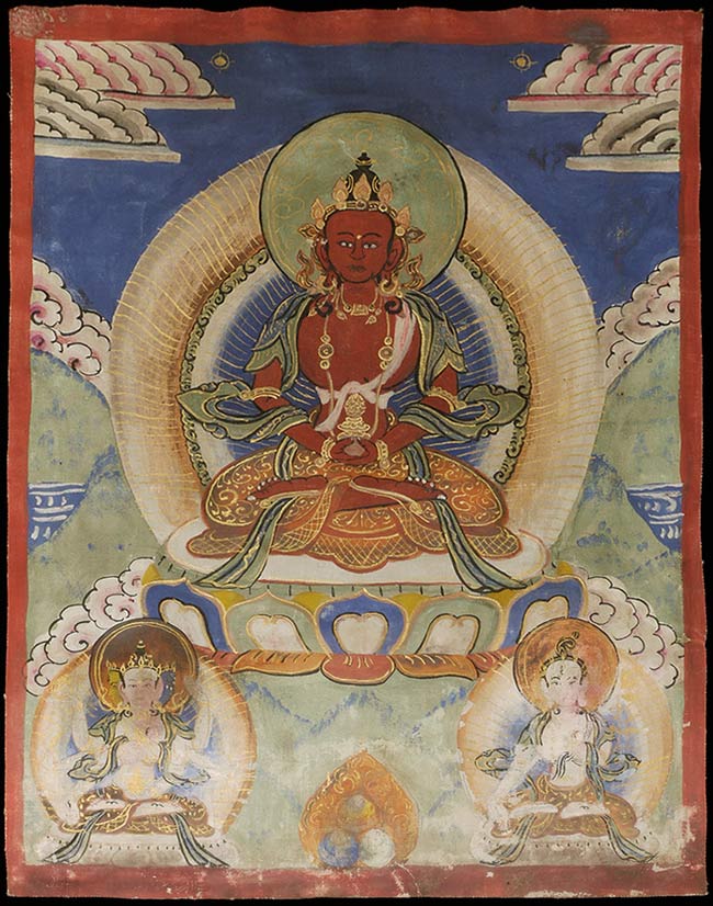 A lovely old/antique Mongolian Thangka, measuring 8⅛ inches (20.6 cm) H x 6 inches (15.2 cm) W, depicting a radiant red-hued deity seated in deep meditation upon a lotus throne. The figure is encircled by a luminous mandorla, enhanced with fine gold detailing that highlights the intricate robes and celestial ornaments. Rich mineral pigments—especially the deep blues and warm reds—attest to skilled traditional craftsmanship. Natural age wear lends authenticity and character to the composition. Elegant, vibrant, and spiritually resonant, this Thangka is an excellent addition for collectors seeking refined and culturally significant Mongolian Buddhist art.