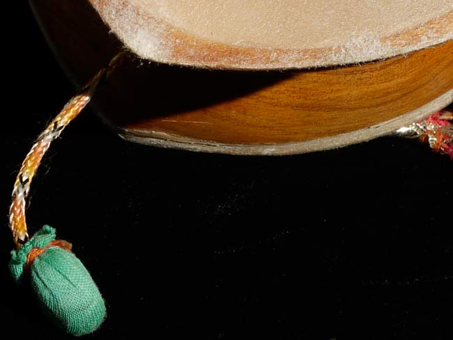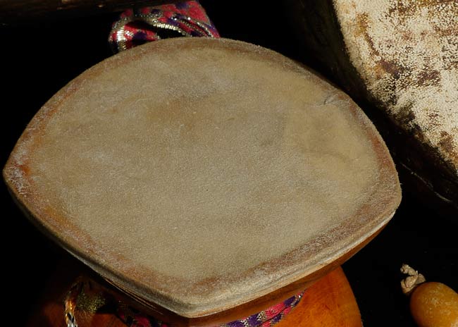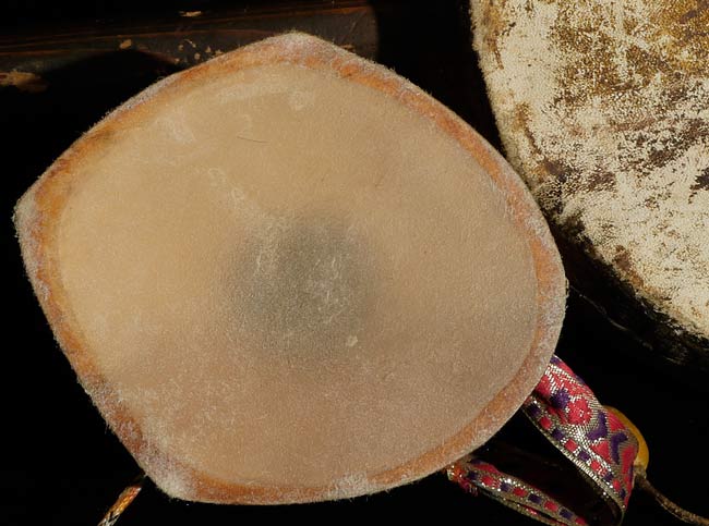 Two vintage/old Chinese drums -- largest has a diameter of 8", thickness of 3.5", handle length 12 3/8". Smaller one is approximately 4.5" x 4" and 2 5/8" thick (tall)