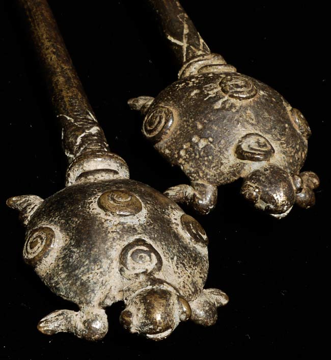 Pair of wonderful early 19thC Indonesian fortune telling bronze Turtle sticks. length is 11.25", turtles are 1.25" wide. One is missing a foot.
