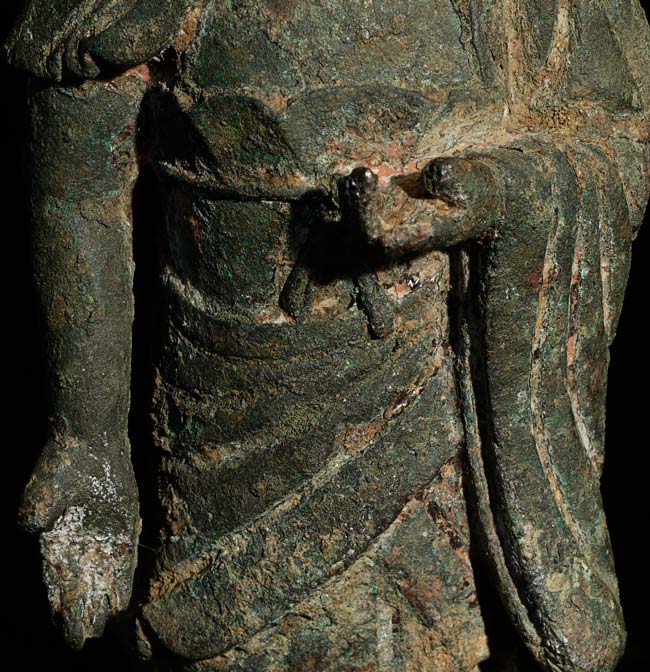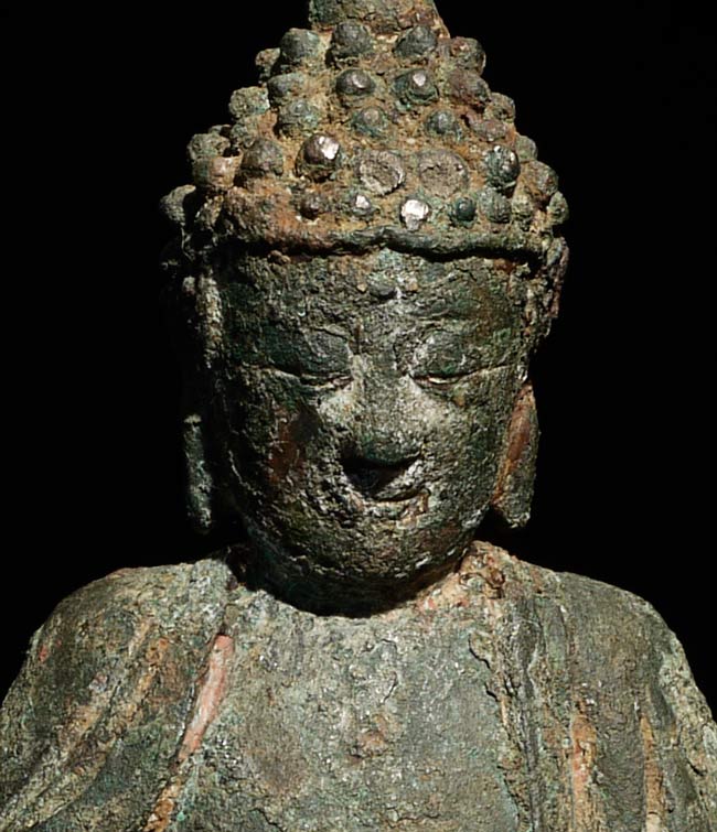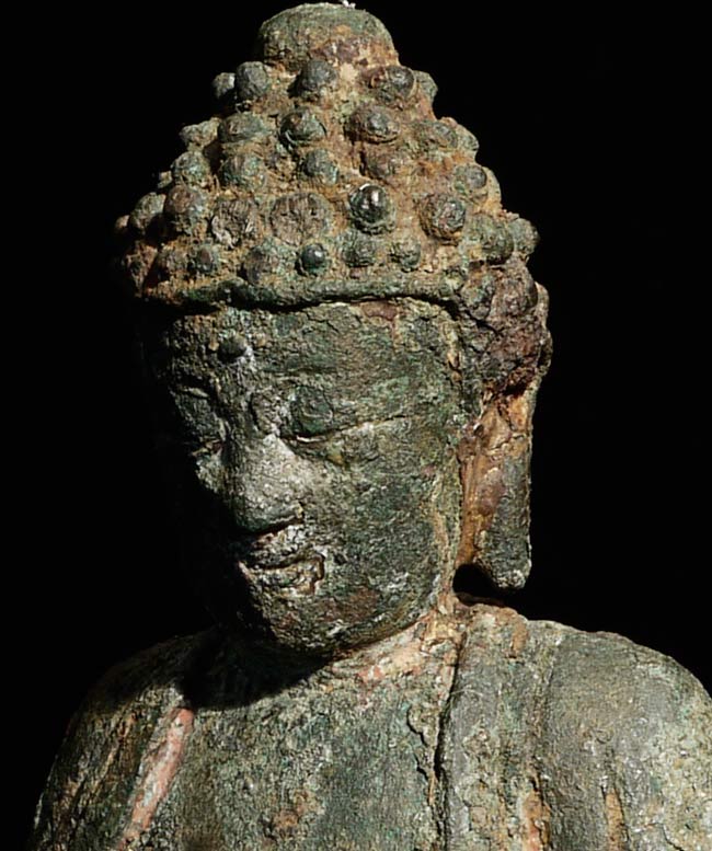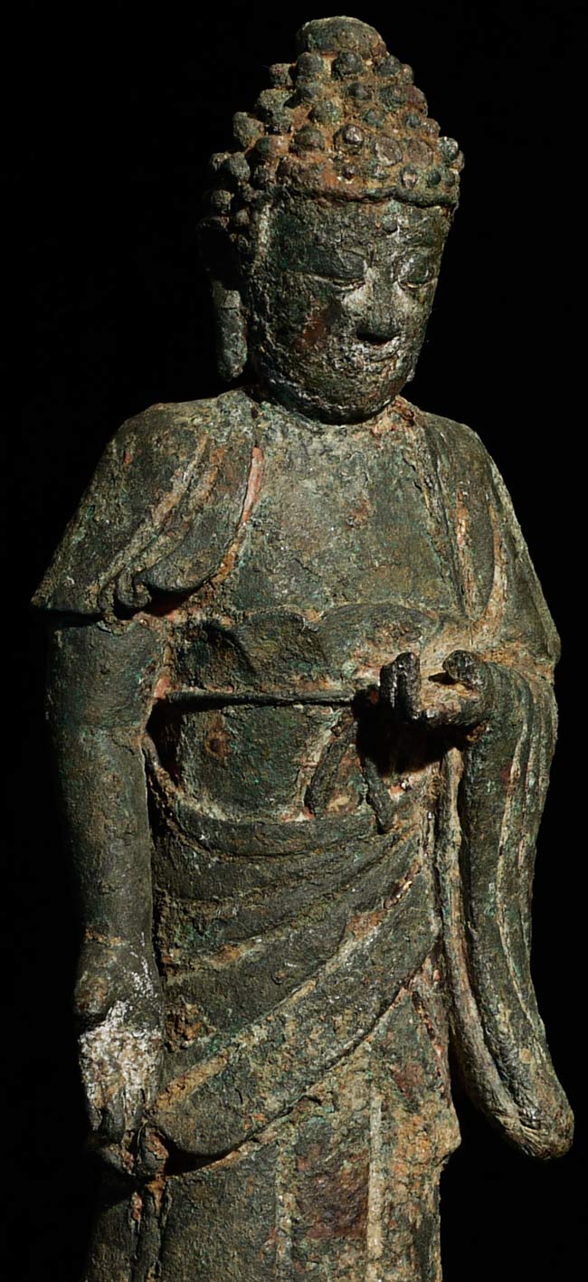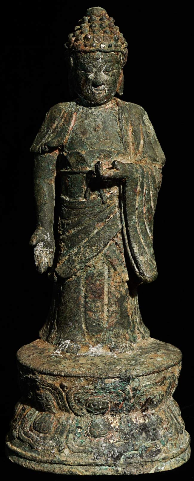 Authentic early Ming bronze Buddha. Much less common in the standing position. 8.75" tall, bottom measures 3 5/8" x 2.5"