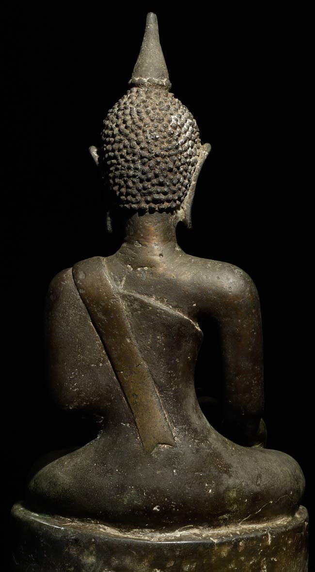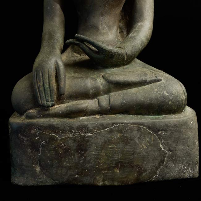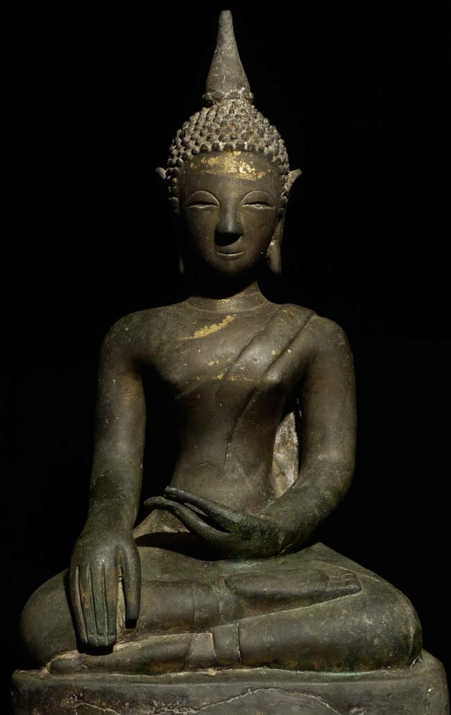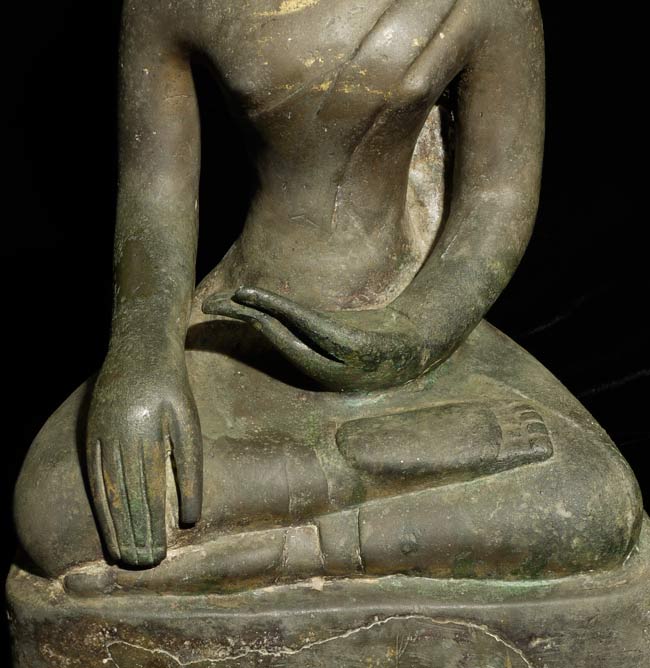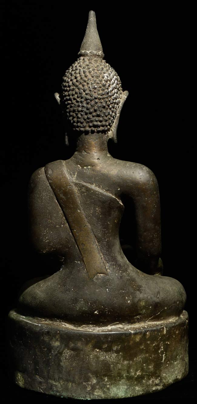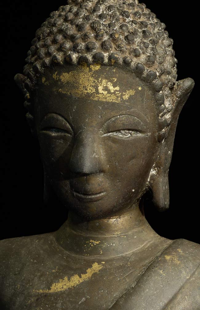 This is a very uncommon and early Buddha: it has many features of Laos Buddhas, although I believe it is from Fang, in the far north of Thailand. This area has it's own local style of Buddhist art that goes back to the 14th century. The very distinctive and large cupped hand, as well as the distinctive face and long neck look quite related to other early Fang Buddhas I have seen. It is a very good size at 12 and 1/4 inches high and 6.5 inches wide at the base, and it is quite heavy. It is in very good condition for a Buddha of this type. There is a cast-on repair to the front of the base that appears to be part of the original manufacture. No losses or damage. The gilding on the face and chest are recent, and have been put on as an act of devotion in Thai style. The eyes were originally inlaid. This piece has the quality of good folk art; it is both simple, and at the same time has an undefinable depth.12.25" tall, bottom measures 6 3/8" x 4./5". Very serene!