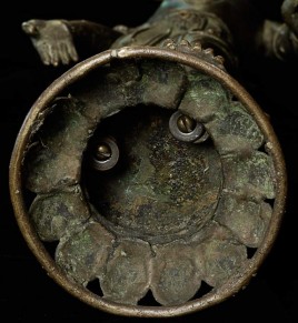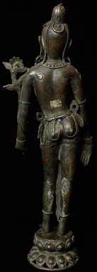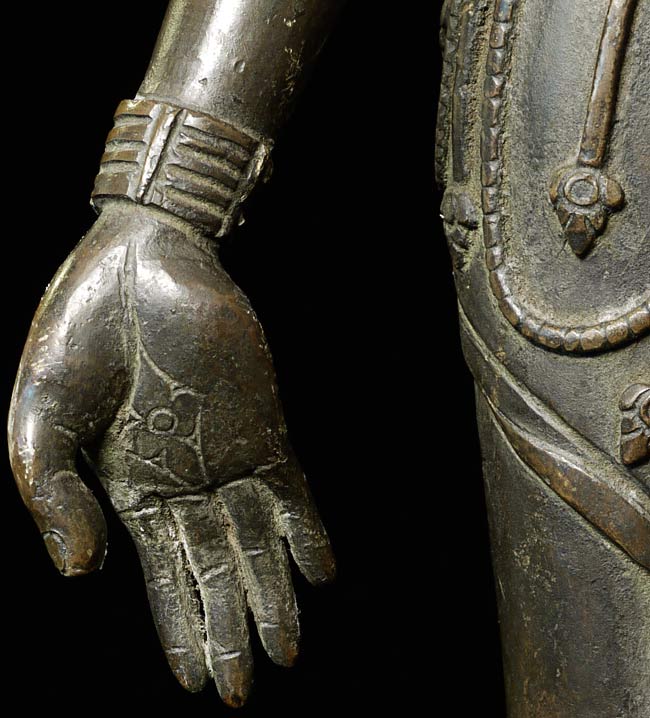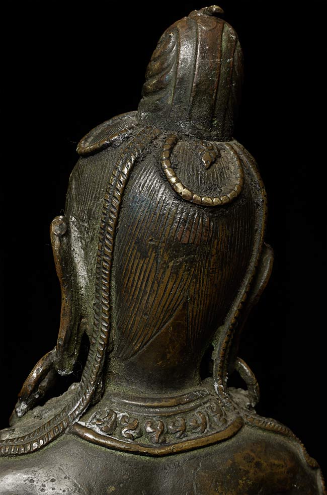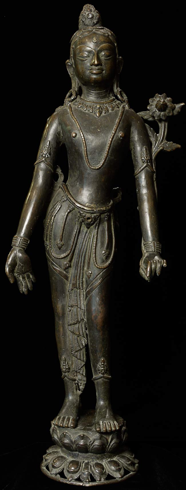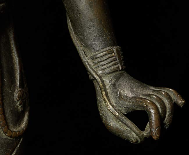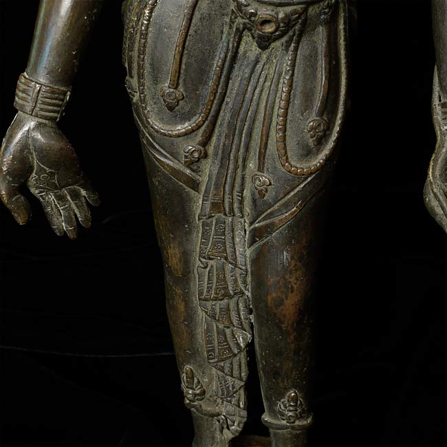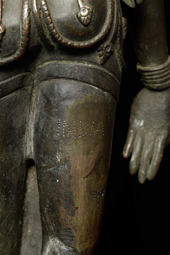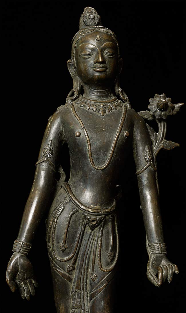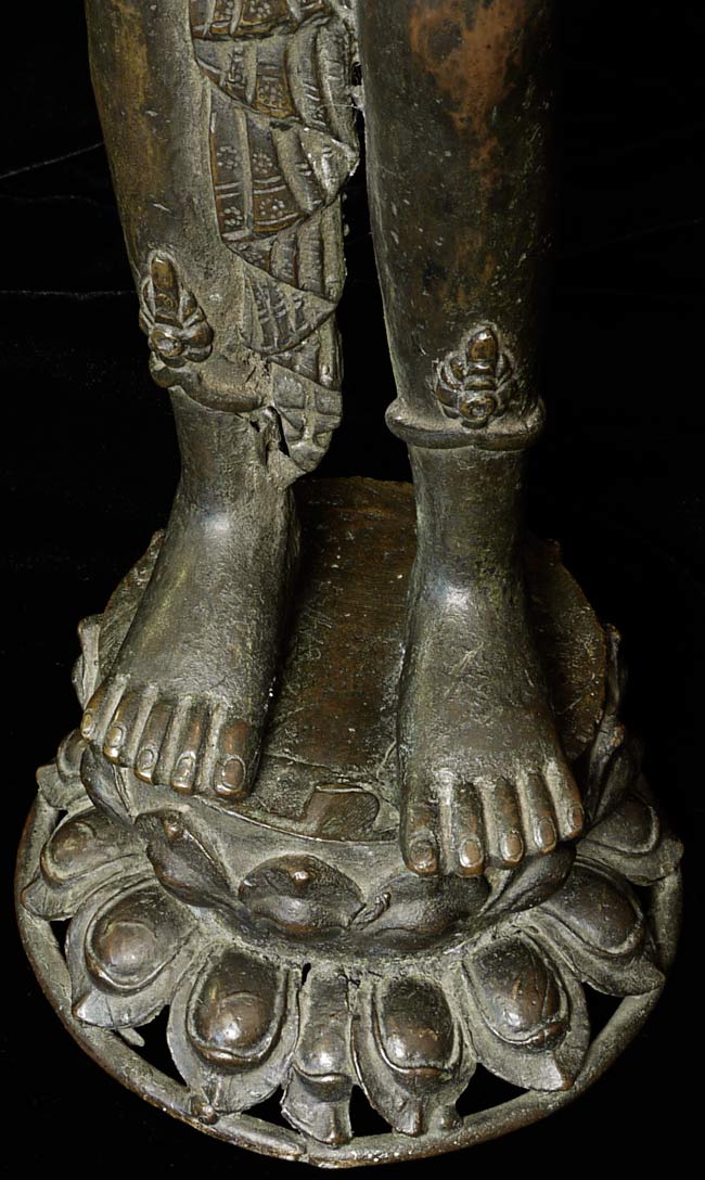 Large, early Nepalese Bodhisattva. Cast in 2 parts and attached at the waist (currently with a modern screw). Rare to find this type this fine and large. I'm not sure how to date- I believe this is atleast early 18thC, and probably earlier Graceful, with a powerful and serene presence. 19.5" total height. Attached base is 2.25" tall, with a diameter of 4.25"