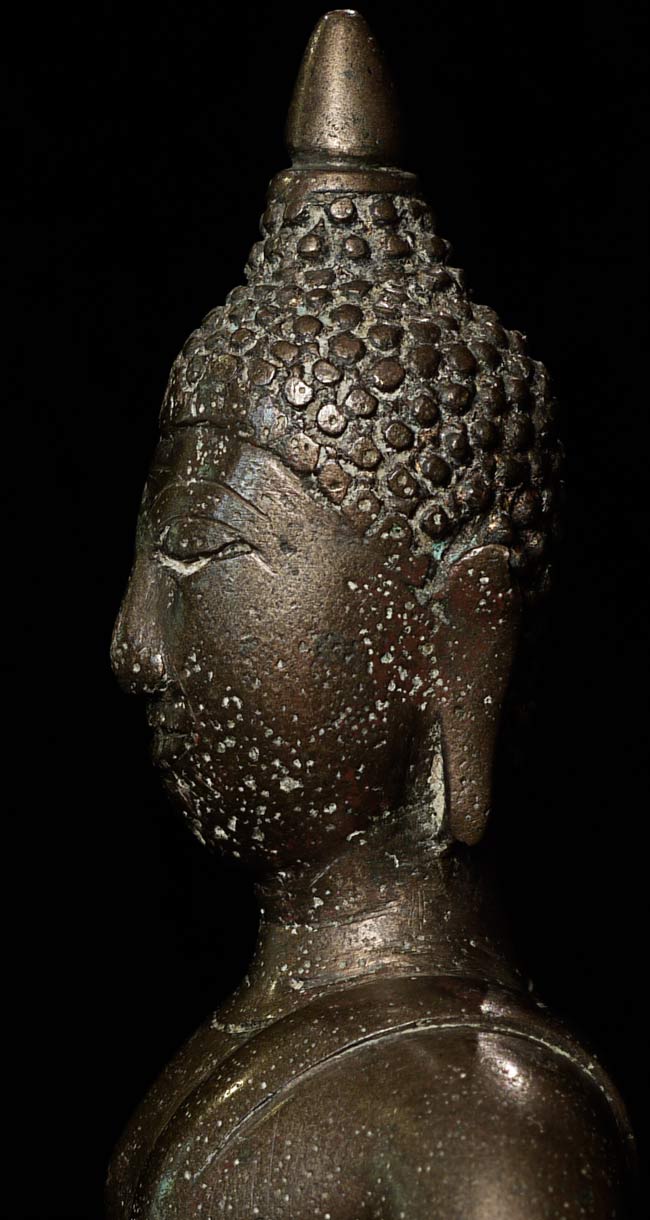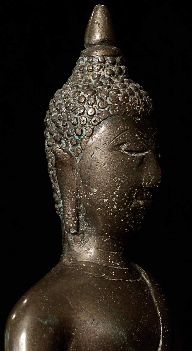 15/16thC Northern Thai Buddha. Nice face, though looks like he could use a shave. Pitting appears to be from original manufacture. The surface was originally covered by lacquer and gilding. Sits 6 1/8" tall, bottom measures 3 5/8" x 2 1/8".