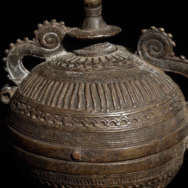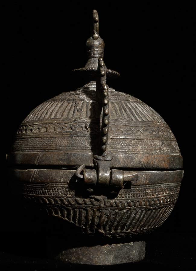 Very decorative old Indian bronze comtainer. 5.75" tall, 5" across at widest point