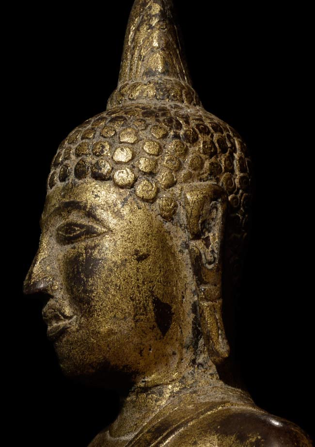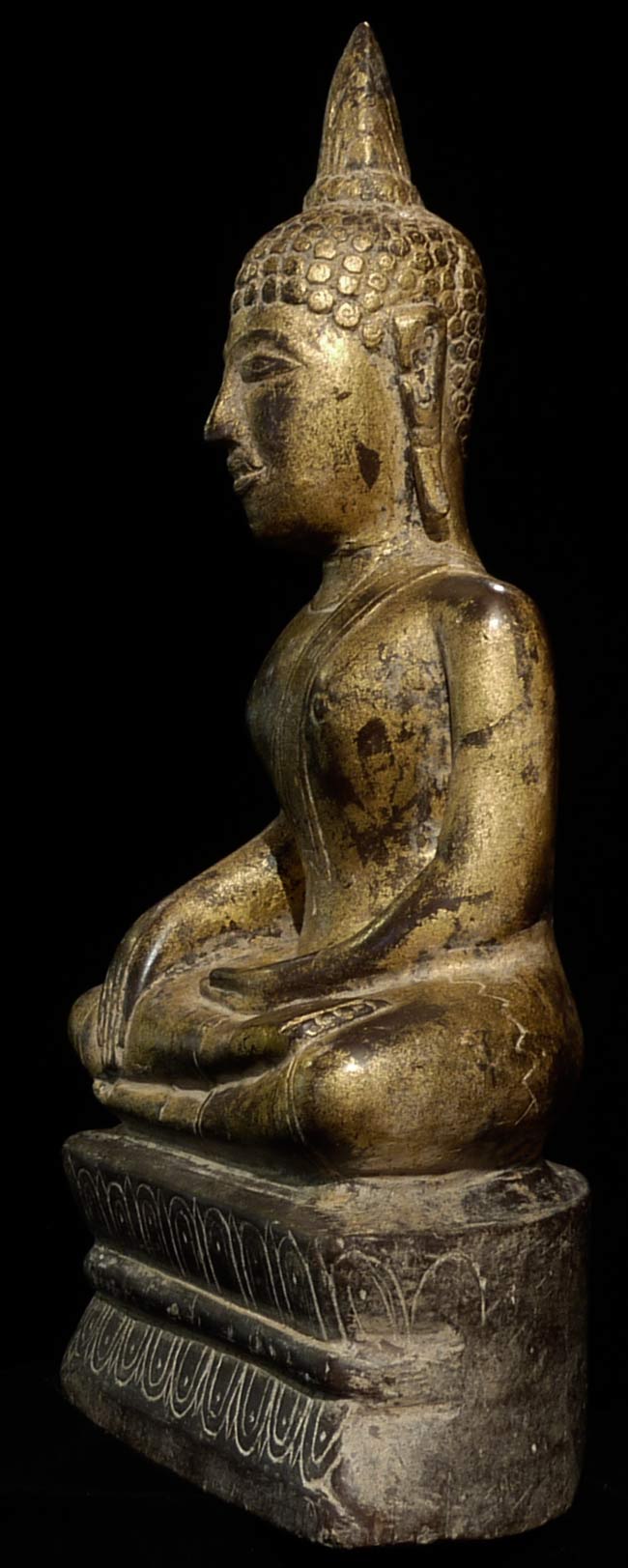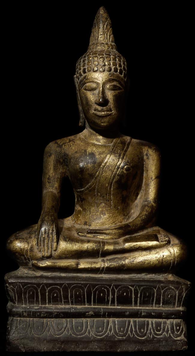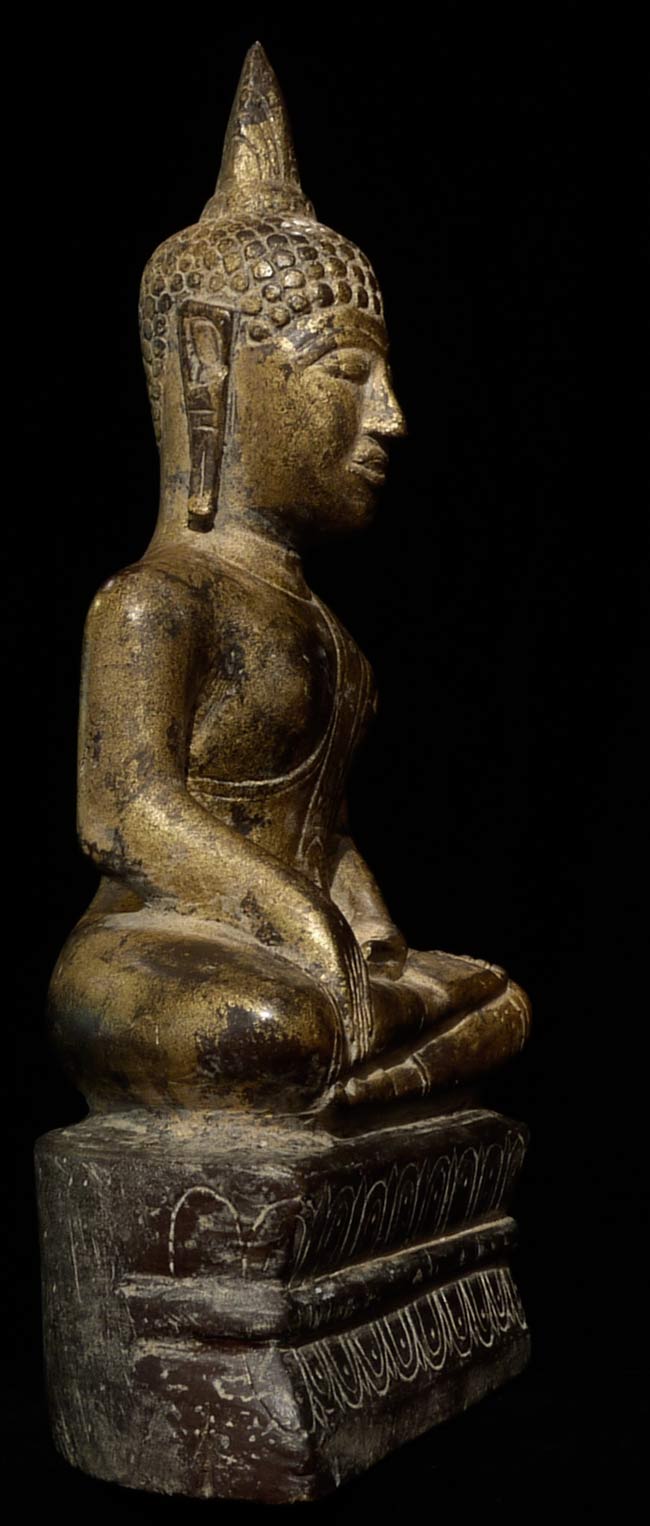 Rare large 17/18thC Large Thai Gilt Buddha. Carved out of a hard stone. Unsusal to find in this size with original patina with no damage or repairs. Readiates a deeply calm presence. Height 13.5", width 7", depth 3.5"