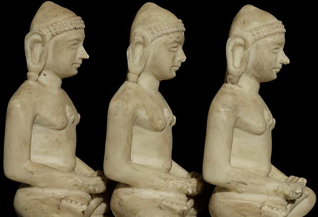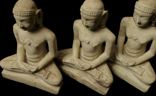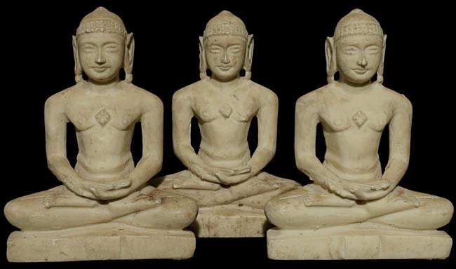 A set of three old Jain figures. Cast or scilpted out of a composite material I cannot identify. Some wear, chips and staining as seen in the photos. Rare to find a set like this. . 5" tall, bottoms measure 4" x 1.75".