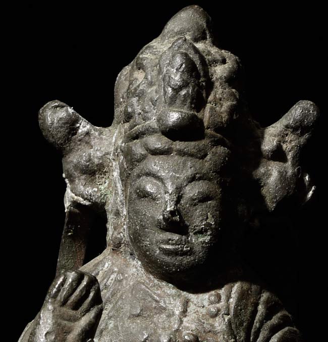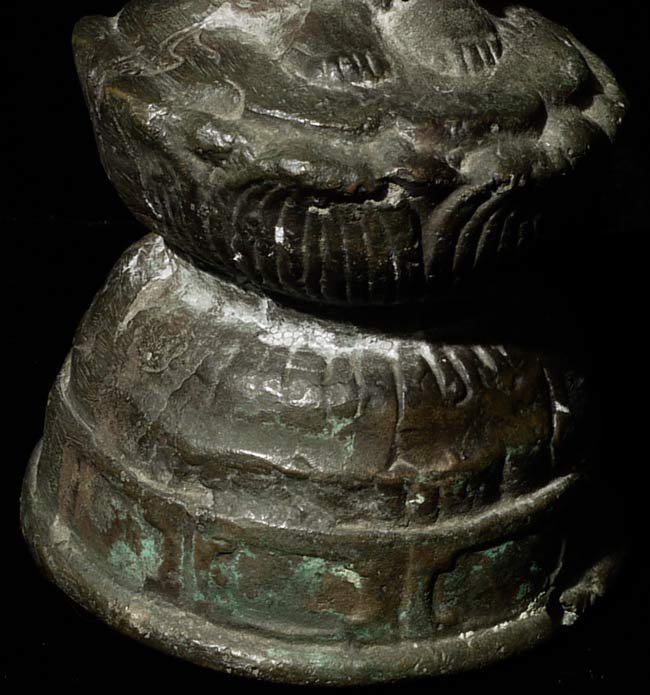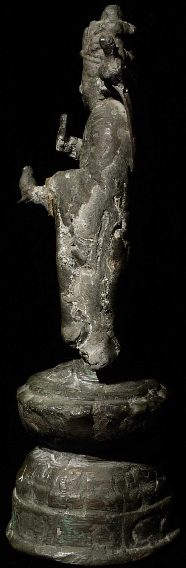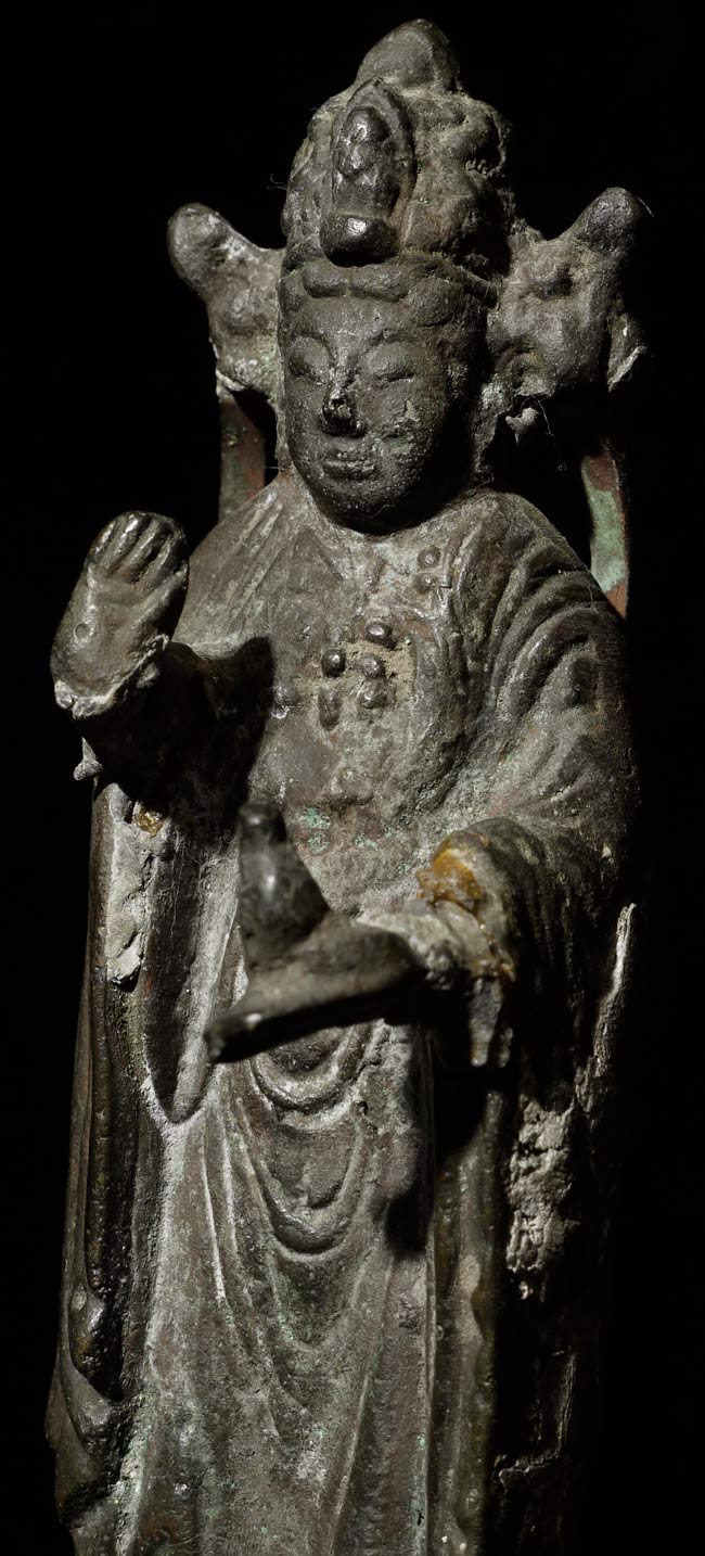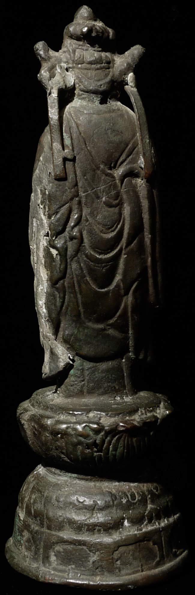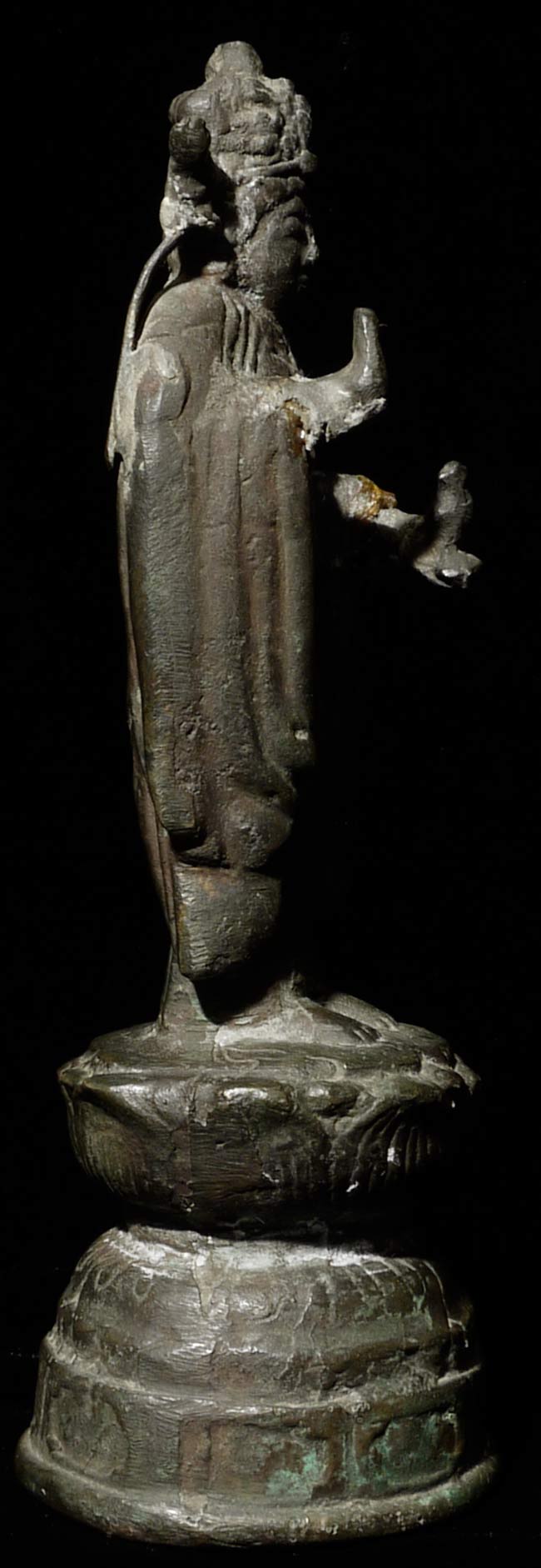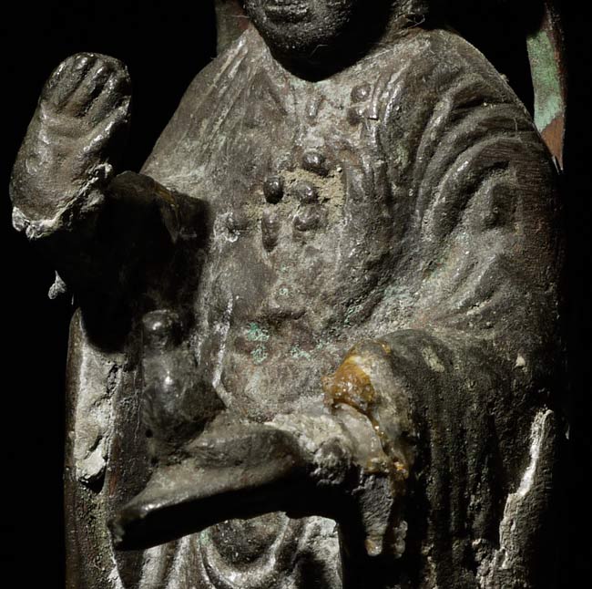 Mystery Buddha. Appears to be a provinicial very early Buddha from China or Korea. Hands and ribbons re-attached numerous times over the years. Significant wear. Probably extremely old. 7.75" tall, bottom has a diameter of 2.5"