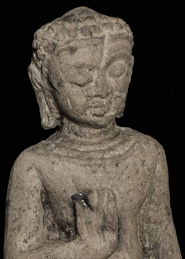 Very rare 12/13thC Haripunchai terracotta Buddha. Remarkbly, appeas to be complete with no repairs. Haripunchai Kingdom was strongly influenced by the Khmer Kingdom, but has its own unique style.