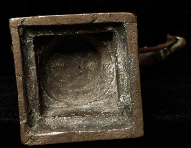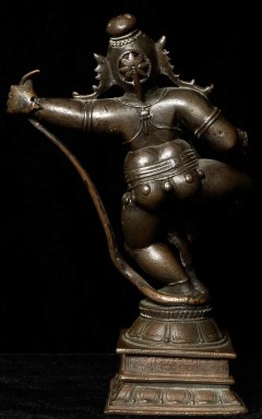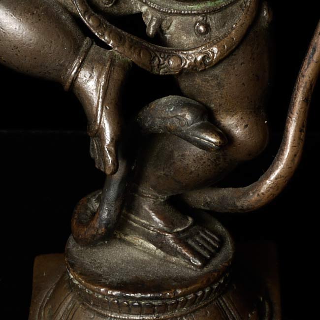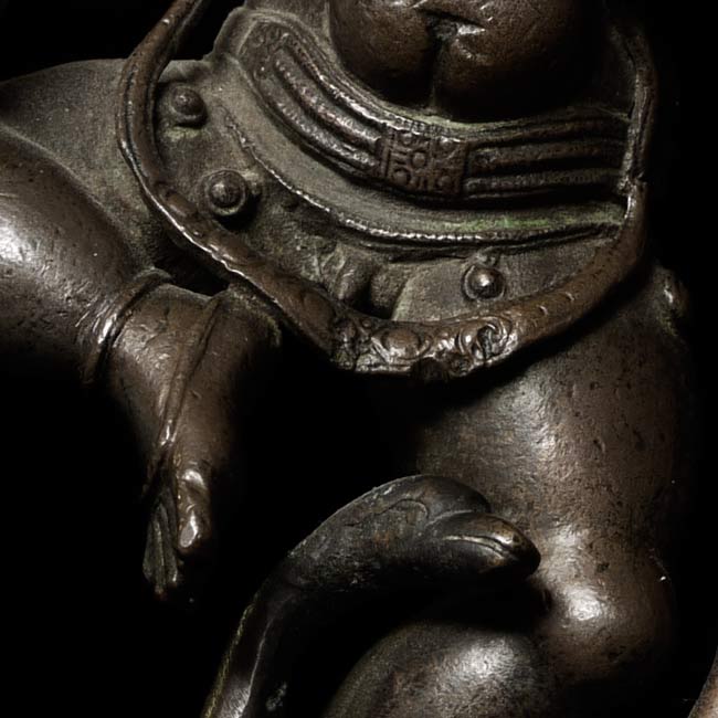 Very best quality 19thC Hindu Bronze. Wonderful in every way- sculpting and finishing, patina, sense of livliness, and beautiful face. He is missing something which was in his right hand, and has a (poorly repaired) break in his left wrist. 6" tall, 4" at widest spot, 2" deep