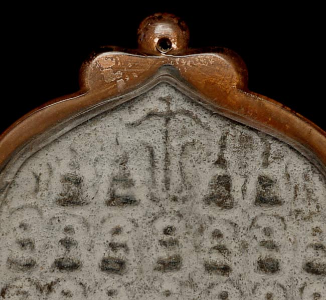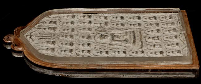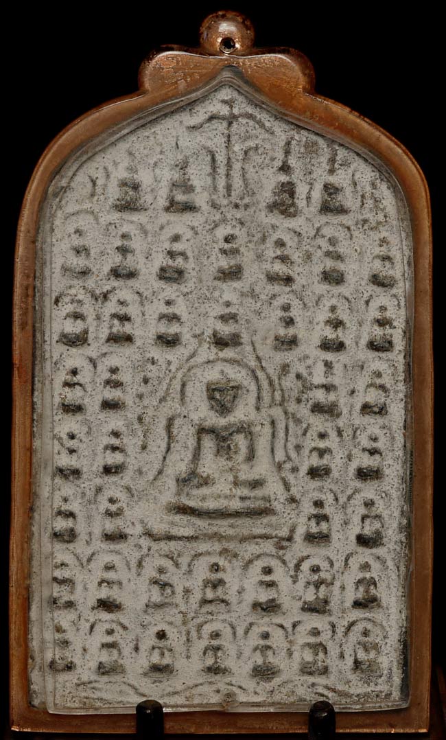 12/13thC thickly cast Burmese Pagan Buddha Plaque has 40 small Buddhas and one larger one in the center. Extremely heavy for this type of piece. Encased in acrylic. Measures 5 5/8" tall, 3.25" wide, .5" thick. Optional stand is 1.25" tall, 3.5" wide x 2.5" deep. I've never seen another quite like it.