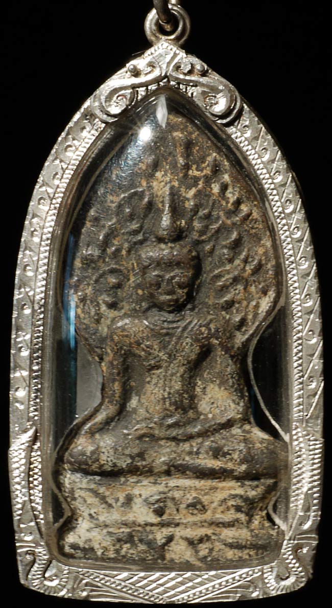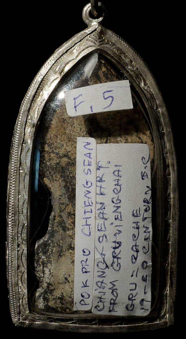 Authentic 15thC Chiang Sen Buddha Amulet. In a modern amulet case surrounded in silver. 2.75" tall, 1.5" wide, .5" deep. Date on back is in the Thai Buddhist Calendar (we are in the year 2554)
