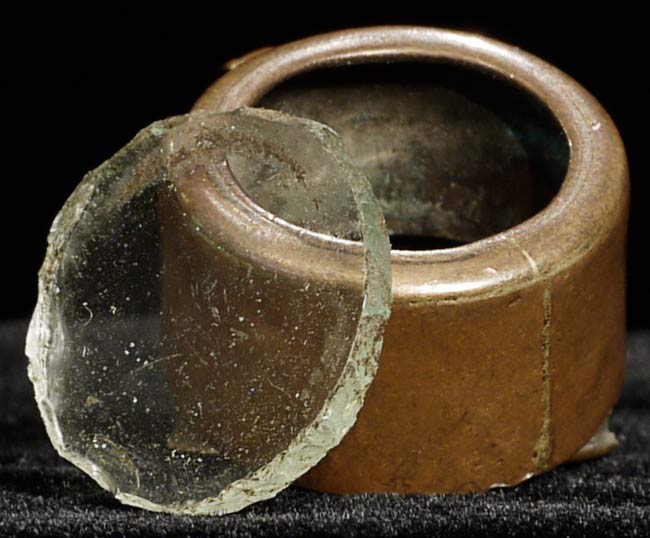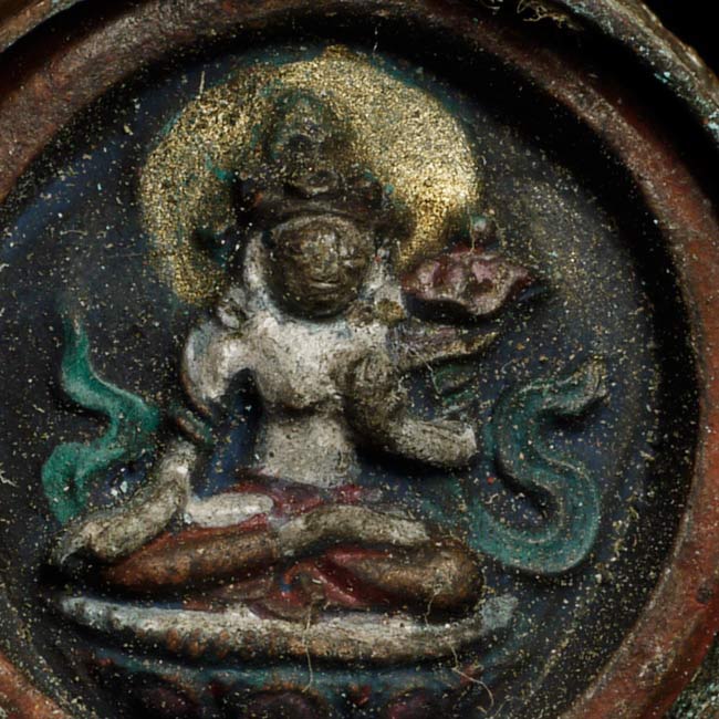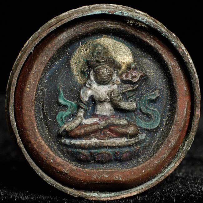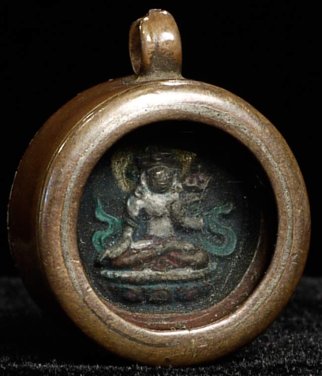 Poweful 19thC extremely small Mongolian clay tsa tsa in copper gau box. .75" in diameter. This is the smallest of its type I have ever seen. From a great old estate.