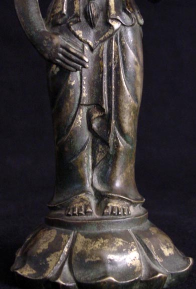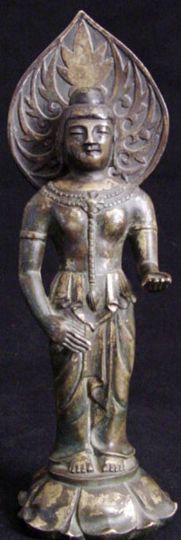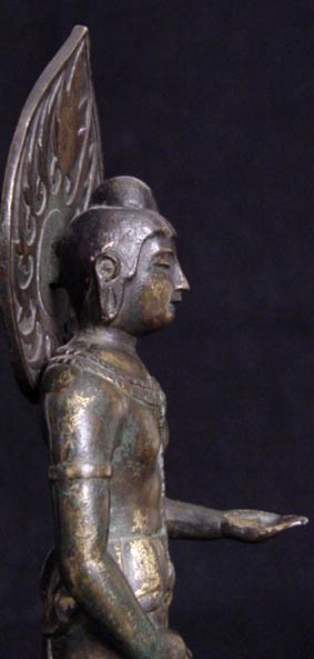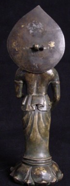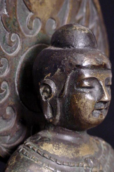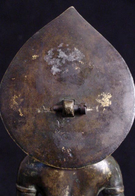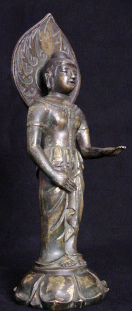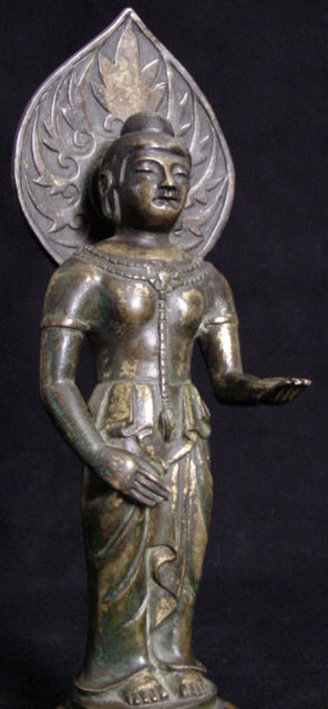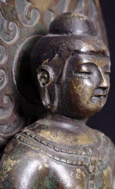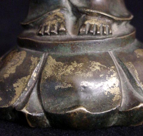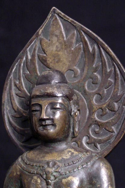 This is a fantastic and joyful Japanese bronze Buddha from the Edo period. The quality of the casting and finishing work is exceptional. Came to me from a highly respected San Francisco American Society of Aappraisers (ASA) appraiser/collector/dealer. It is a very nice size at over 10 inches to the top of the beautiful mandorla. He weighs about 31 ounces. The mudra is an unusual one. Traces of black lacquer on the head, and remains of gilding throughout. This is the nicest Japanese Buddha I have ever had. He has expectable wear, but is otherwise perfect. The Mandorla is held on with a modern screw, which put a few marks on the back. A wonderful and refined piece.