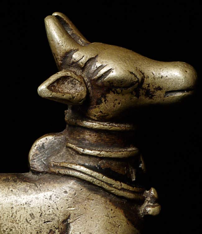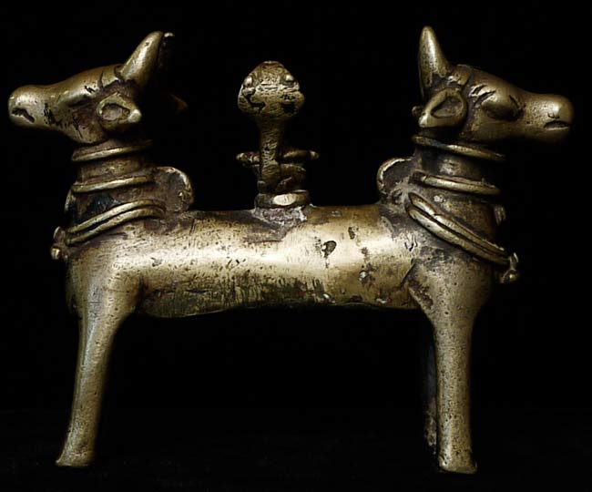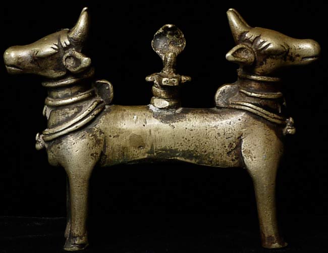 Rare tantric Indian bronze antique 2-headed Nandi. 4" tall, 5.25" long, 2" wide