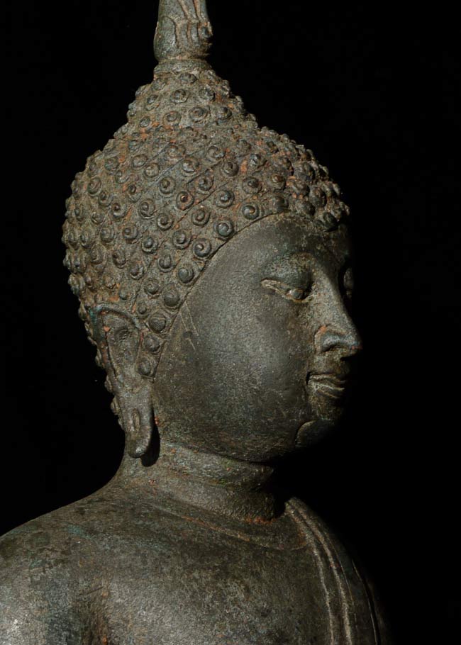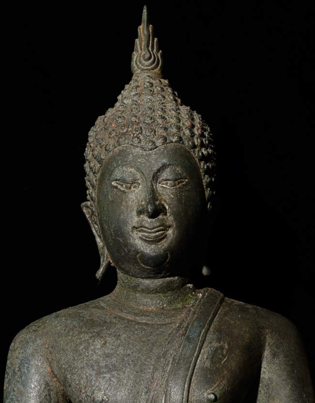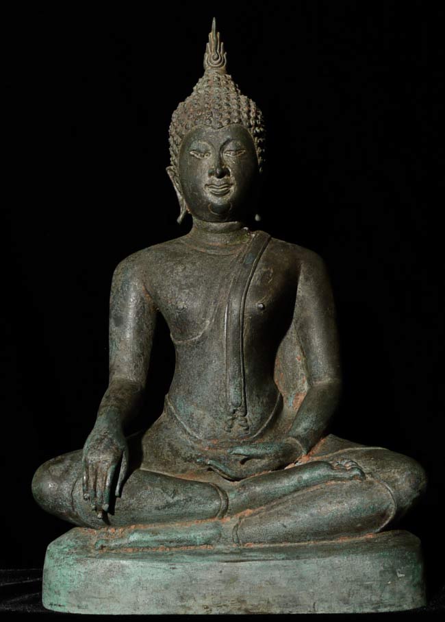 19th to early 20th century Thai Bronze Buddha. Classic well cast example in a very nice size. This is a Post-Sukothai example, rather than the more common Rattanakosin type which is more common to this period. 13.75" tall, bottom measures 8.5" x 4.75"