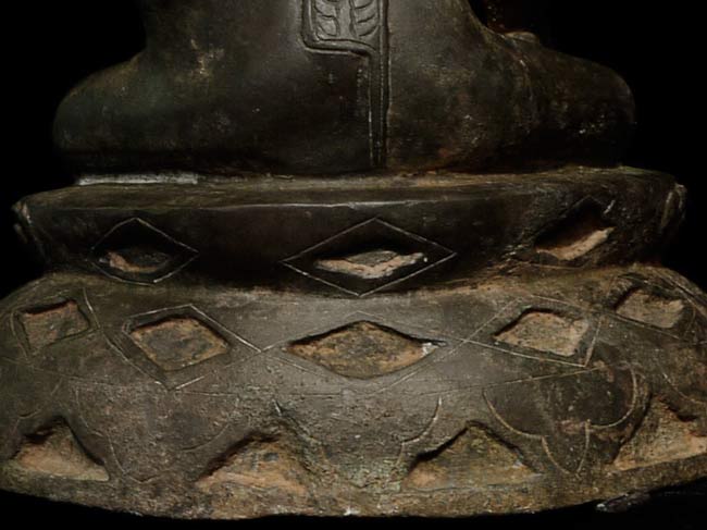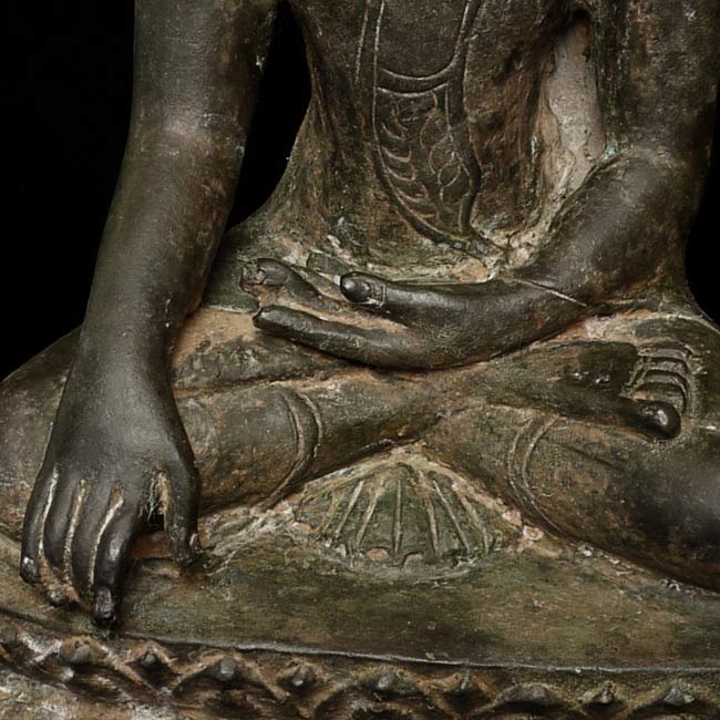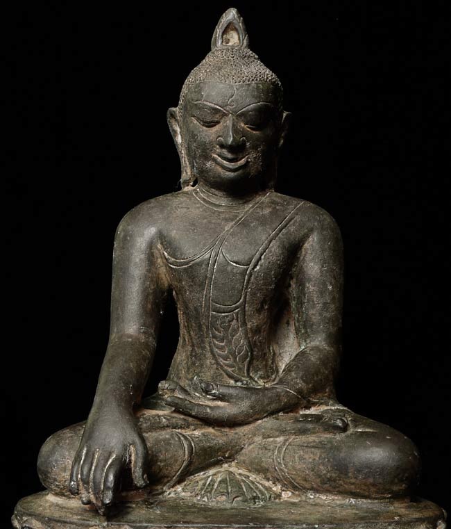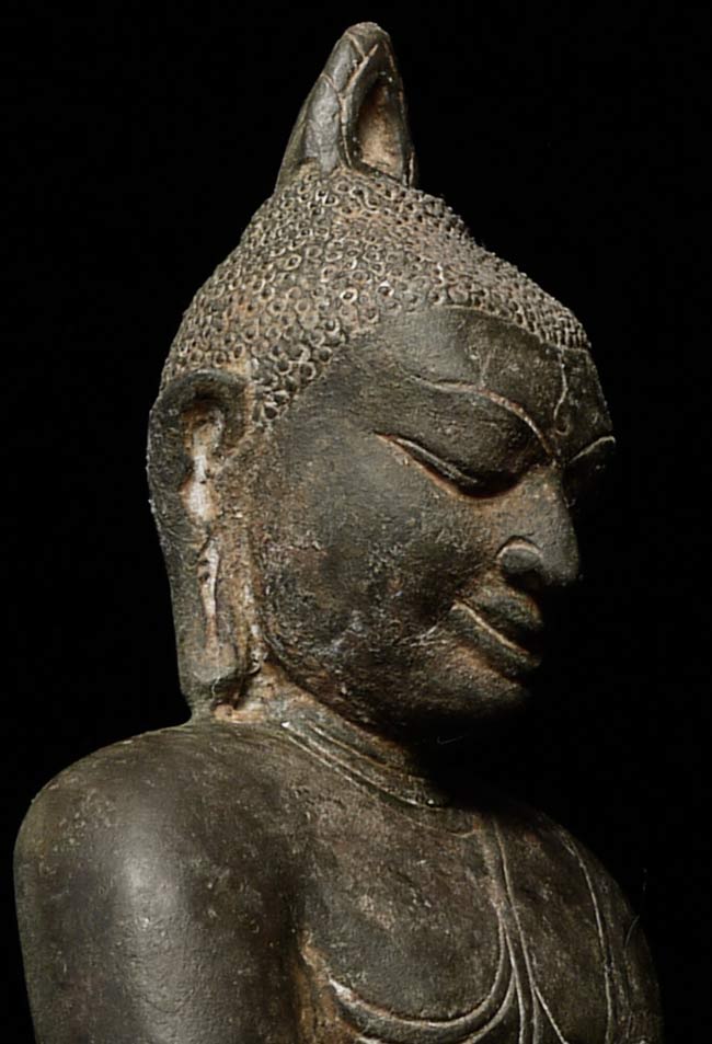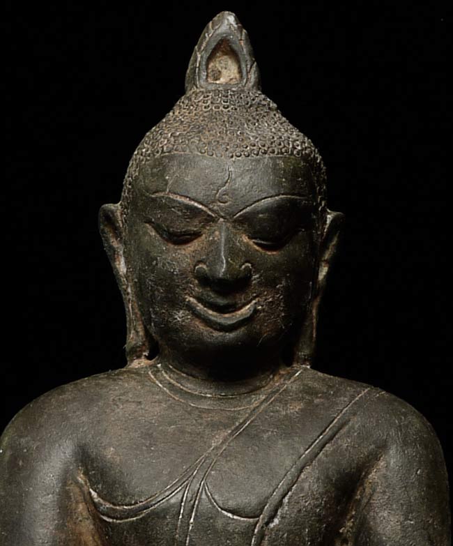Extremely uncommon and very expressive Late Pagan solid-cast Buddha. Hard to date with precision, but I believe this Buddha to be 14/15th century (plus or minus a century or two), and from the "Ava" or "Pinya" periods in Burma. Classic Pagan face and body. Sits 9" tall, bottom measures 6.75" x 4 7/8". Very heavy-a good 15 pounds!