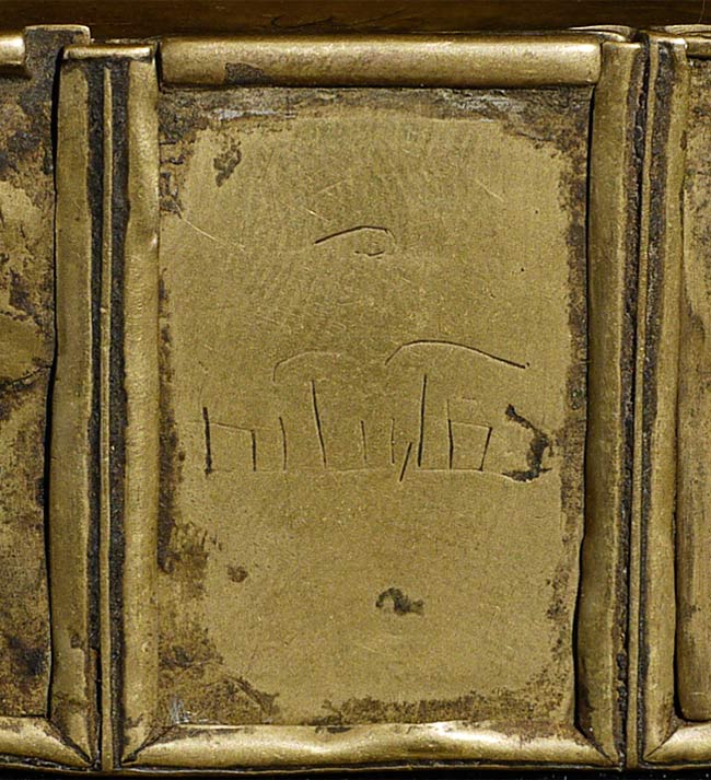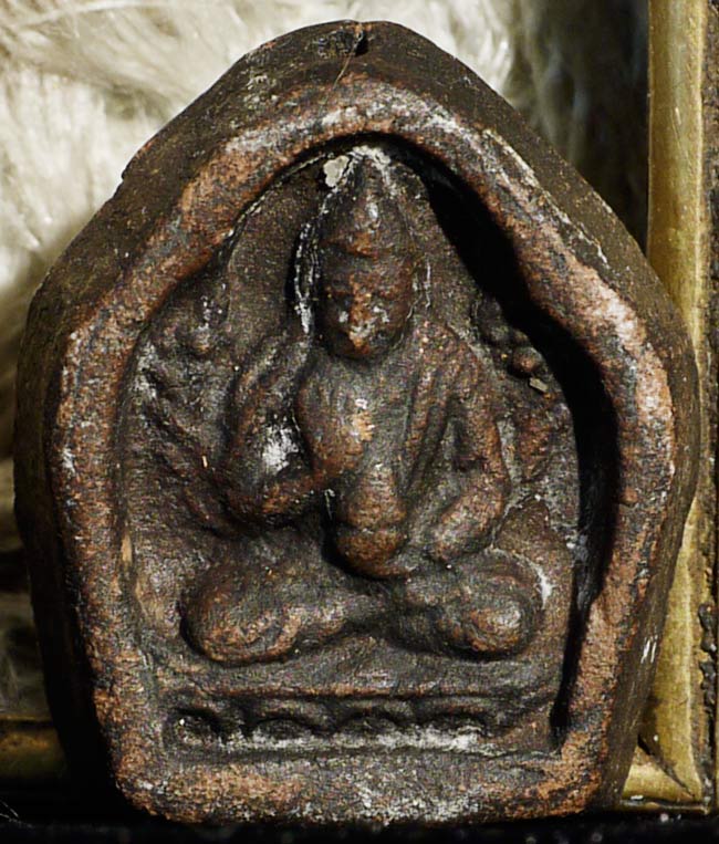 Very uncommon- Mongolian brass box containing 4 small tsa tsas. Box measures 3 7/8" long, 1 7/8" wide, .75" deep. All parts are antique.