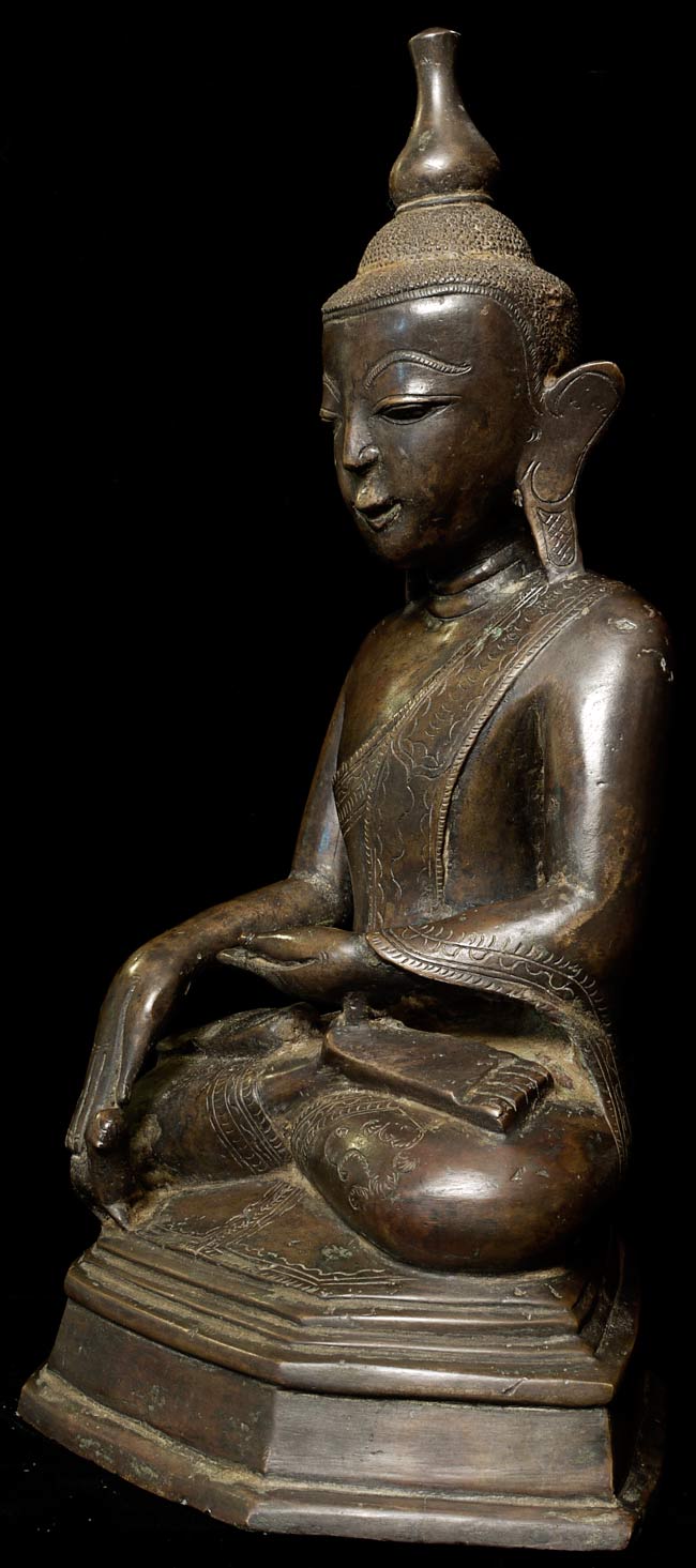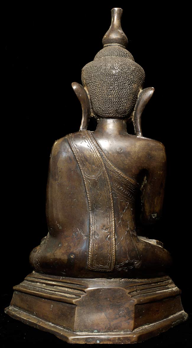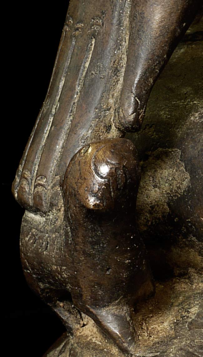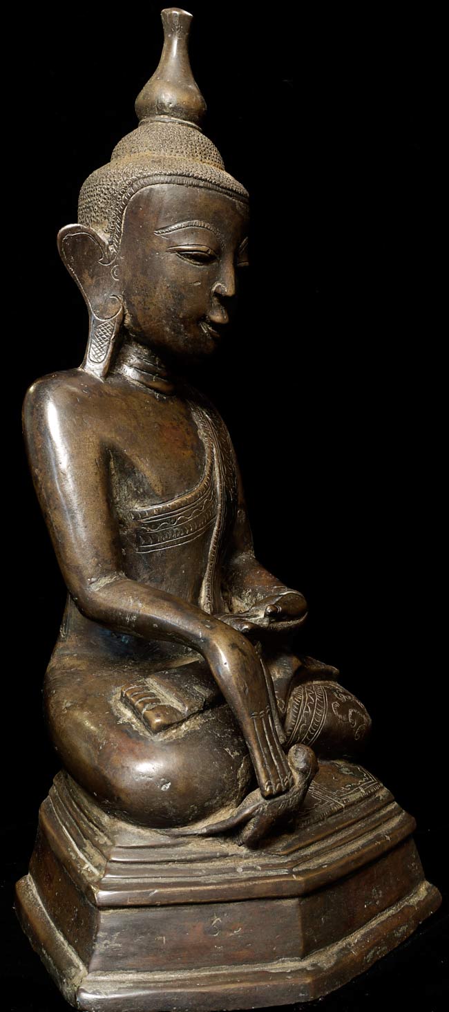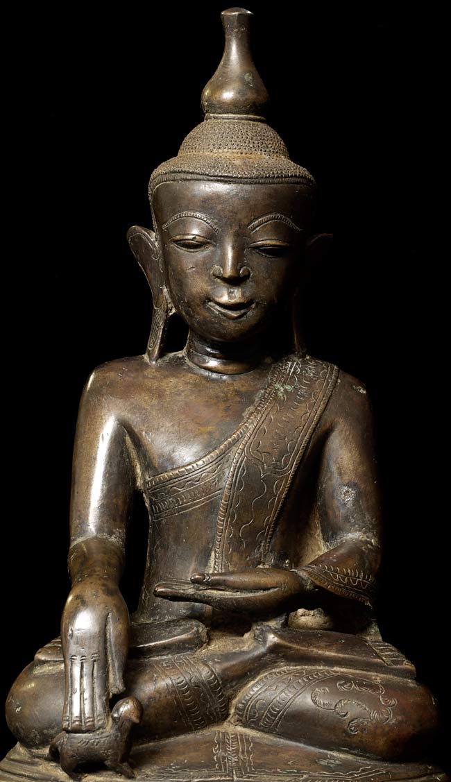 Special 17/18thC thickly cast Burmese Buddha. Quite large (and heavy) at 13.25" tall, the bottom measures 8.5" x 5.5". If this piece had a typical Burmese base it would be closer to 2 feet tall. Note the extremely rare-perhaps unique-animal under his right hand. I've seen only one related example to this one- it had an elephant under the right hand. I believe the animal is a mongoose, and that the inclusion of this
