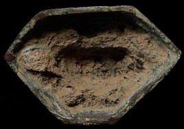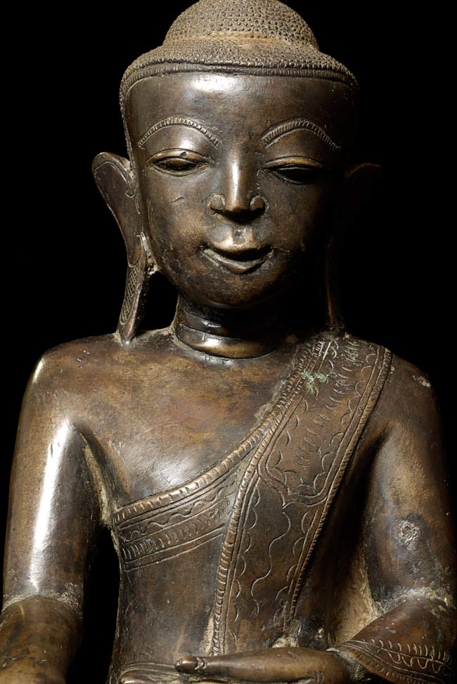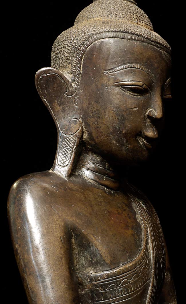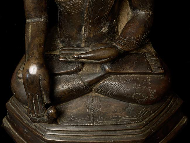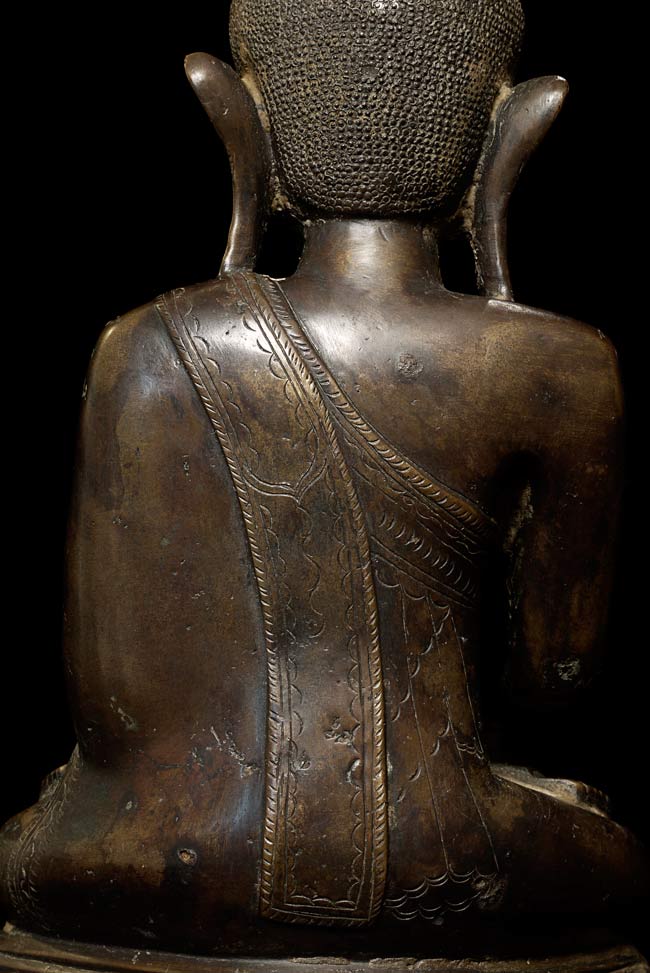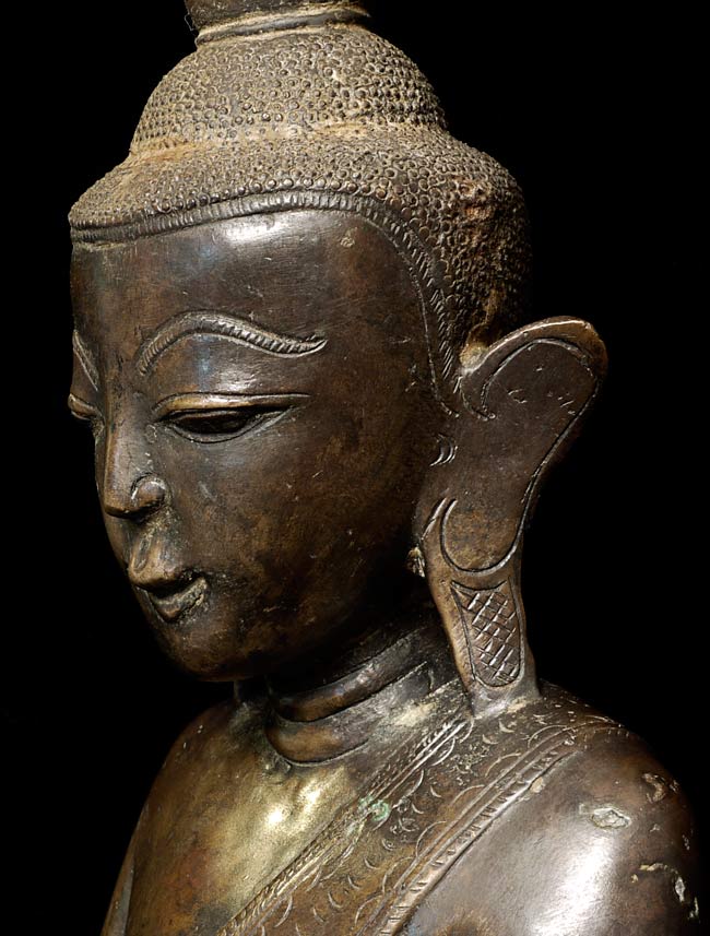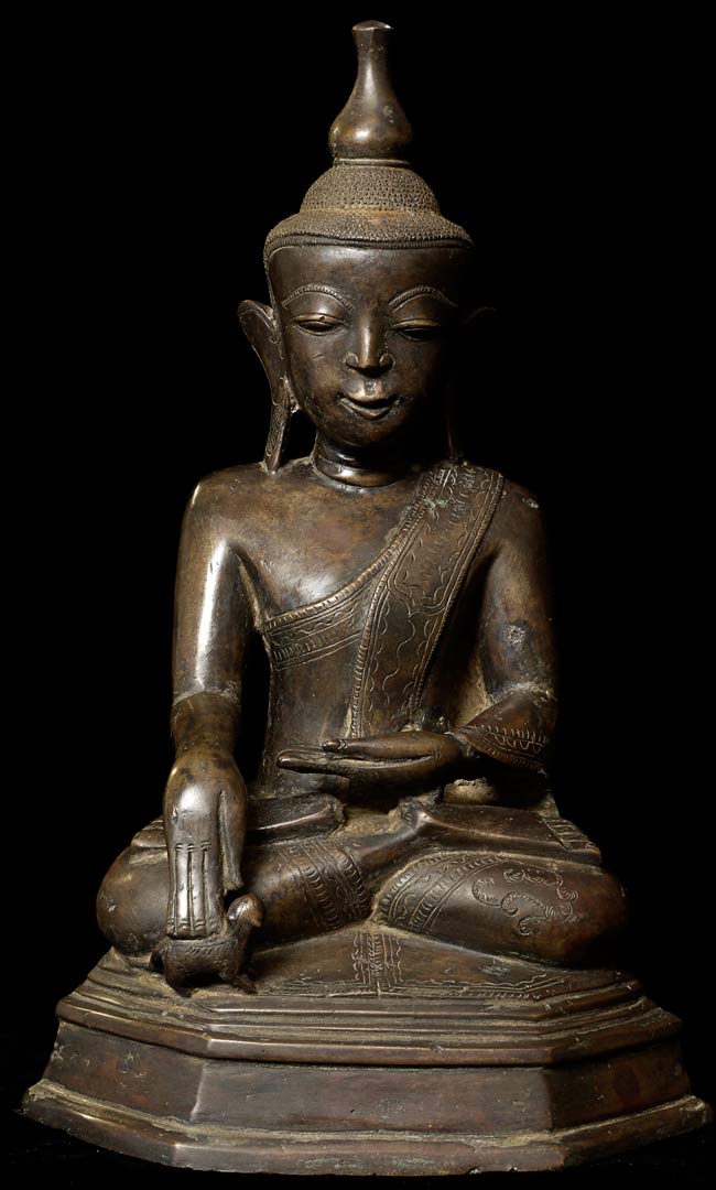Special 17/18thC thickly cast Burmese Buddha. Quite large (and heavy) at 13.25" tall, the bottom measures 8.5" x 5.5". If this piece had a typical Burmese base it would be closer to 2 feet tall. Note the extremely rare-perhaps unique-animal under his right hand. I've seen only one related example to this one- it had an elephant under the right hand. I believe the animal is a mongoose, and that the inclusion of this