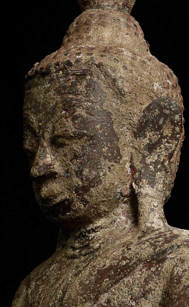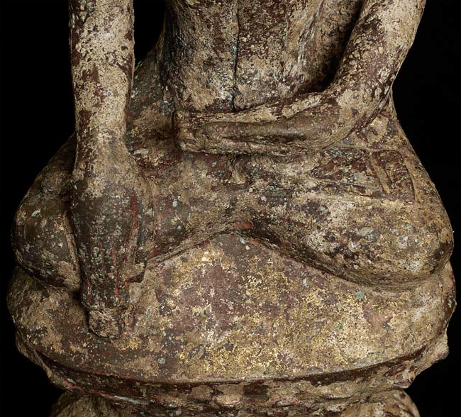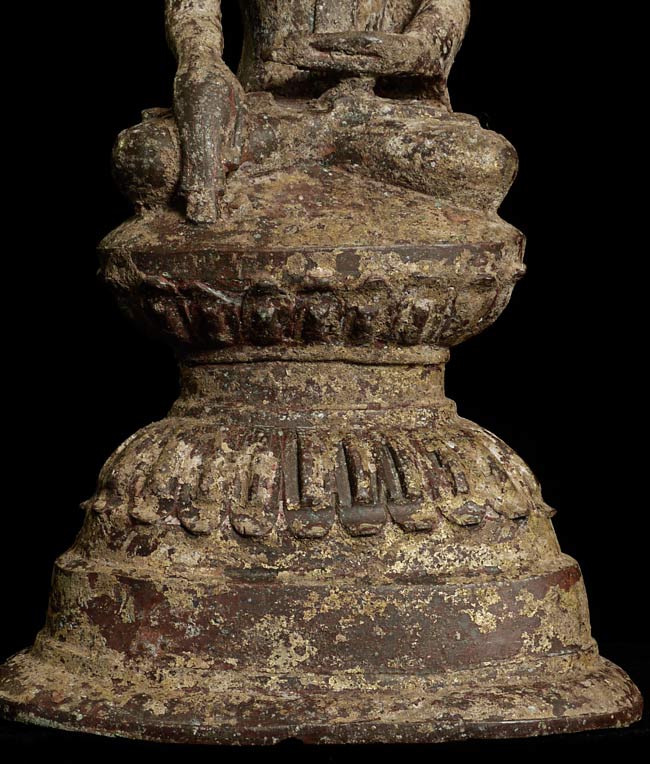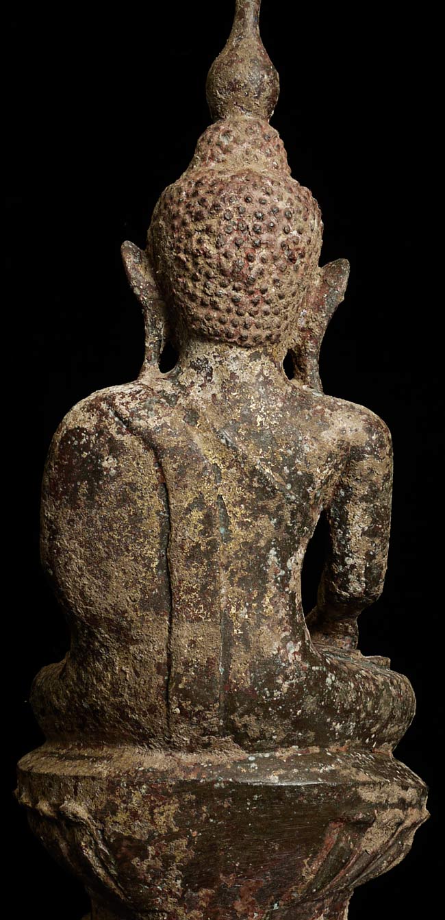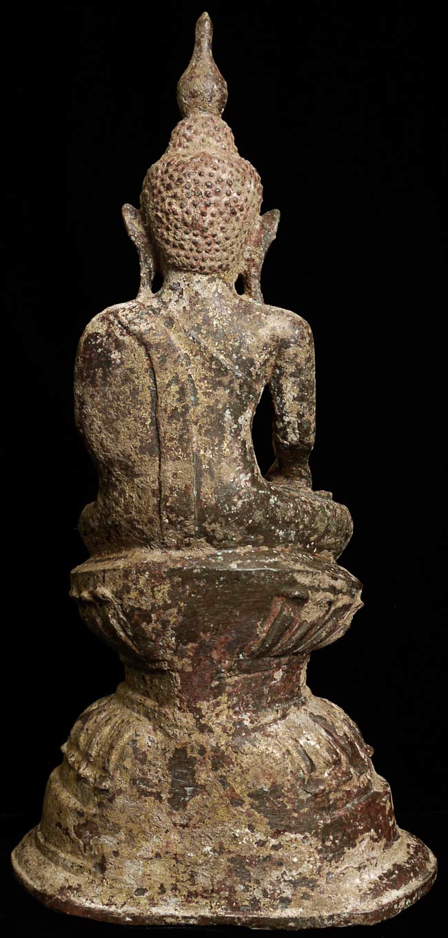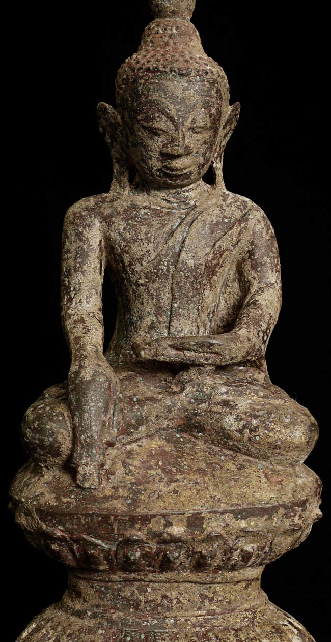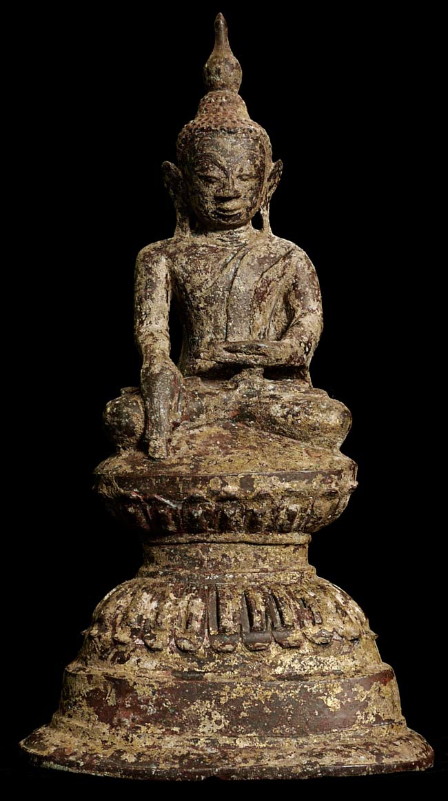 Classic, 17/18thC large Shan Bronze Buddha with a strong, complex burial patina. Deep serenity in his face. 11.5" tall, bottom measures 6" x 3.75"