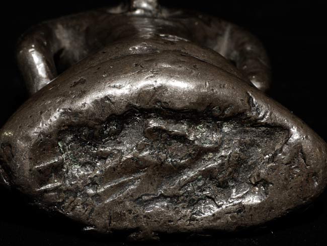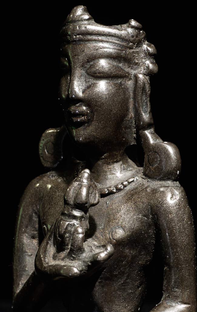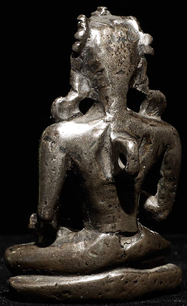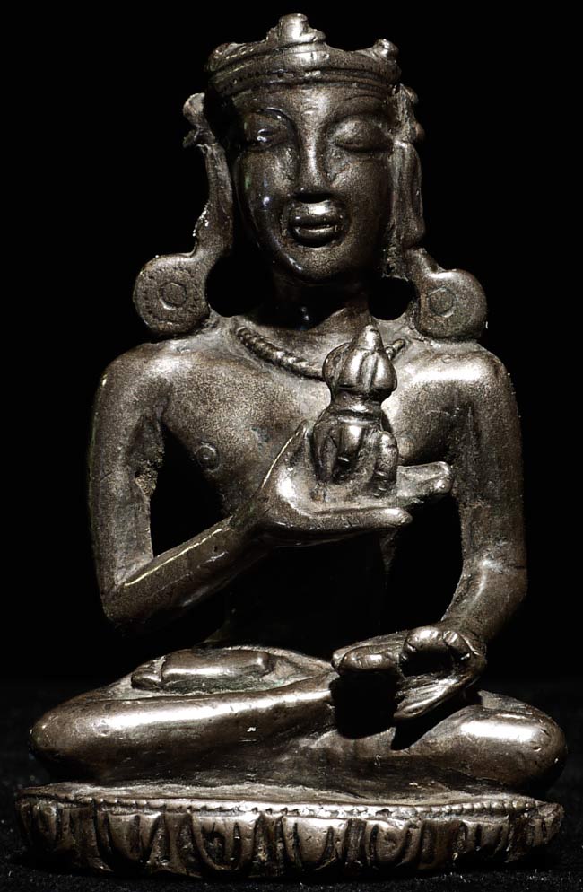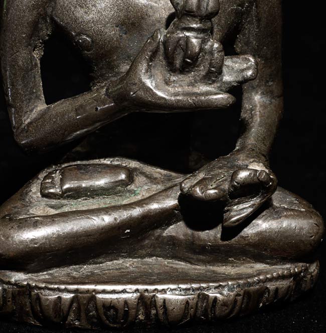 Extremely early Himalayan (in the range of 1,000 years old) Buddhist figure cast out of a special alloy which contains precious metal. Remarkably powerful presence-especially given his diminutive size. Influenced by the Pala style (India) Quite rare. 2.5" tall, bottom measures 1.75 x 7/8"