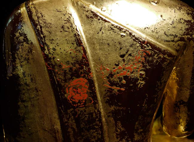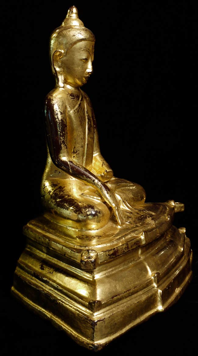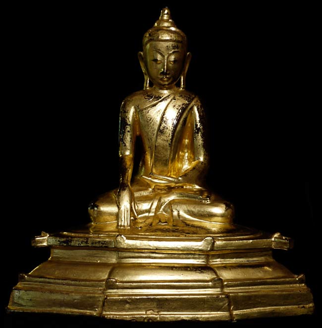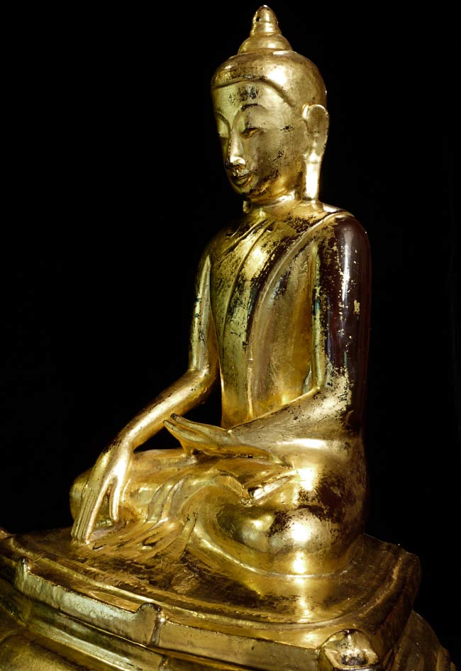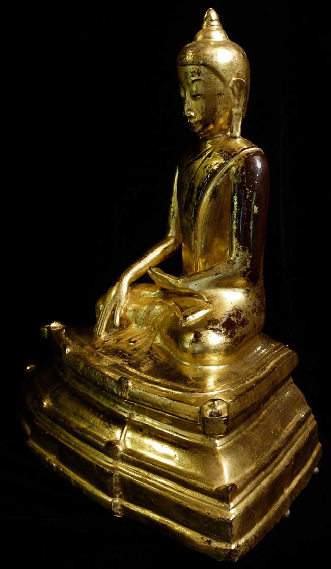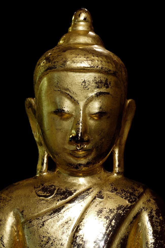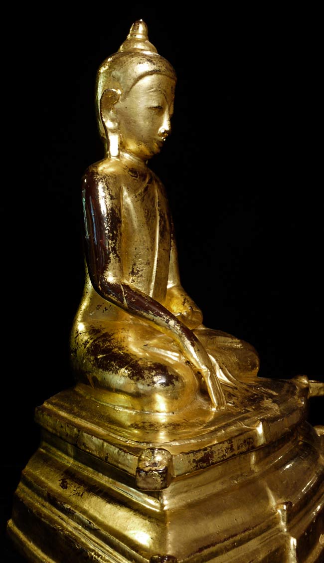 SUPERB 17thC Arakan Buddha with original lacquer and gilding. Photos do not do it justice. Under the lacquer and gilding, this Buddha has fine detail and sculpting. with a powerful presence.