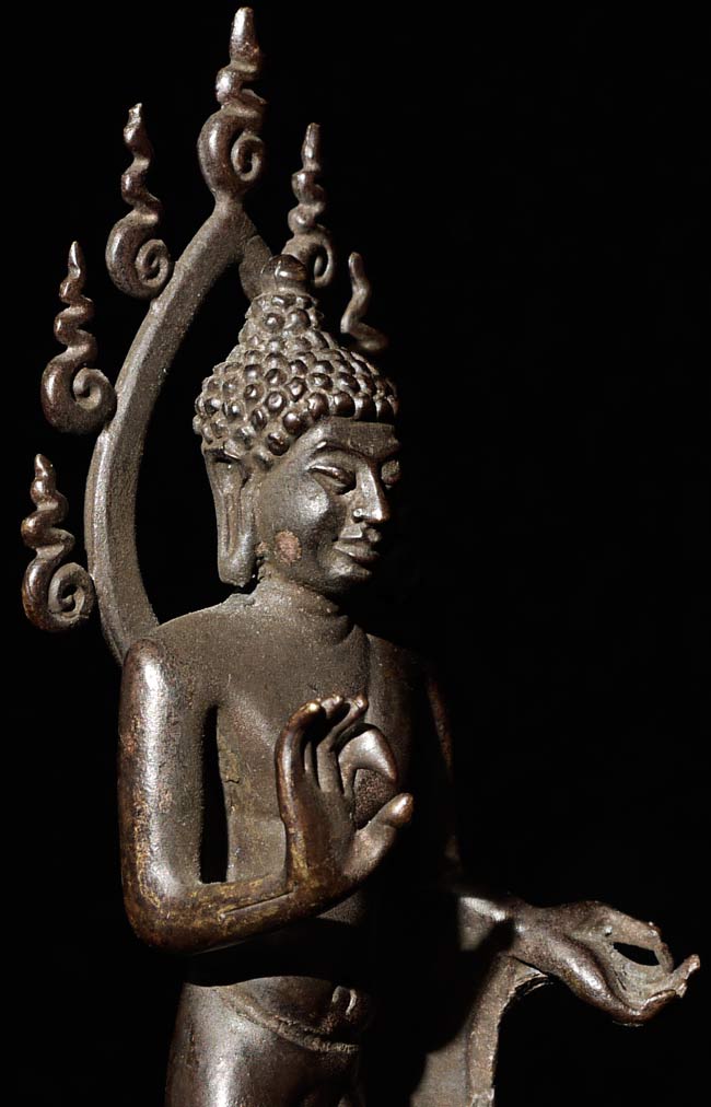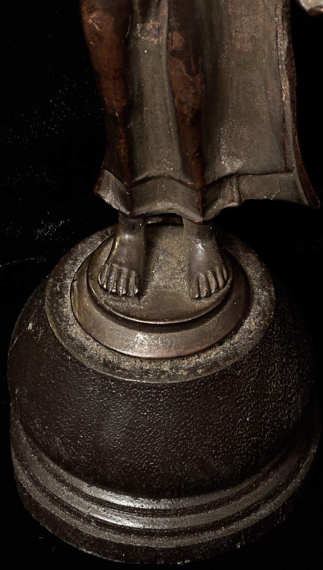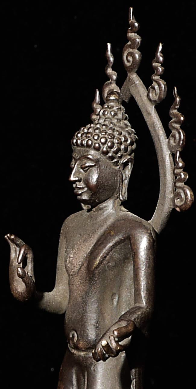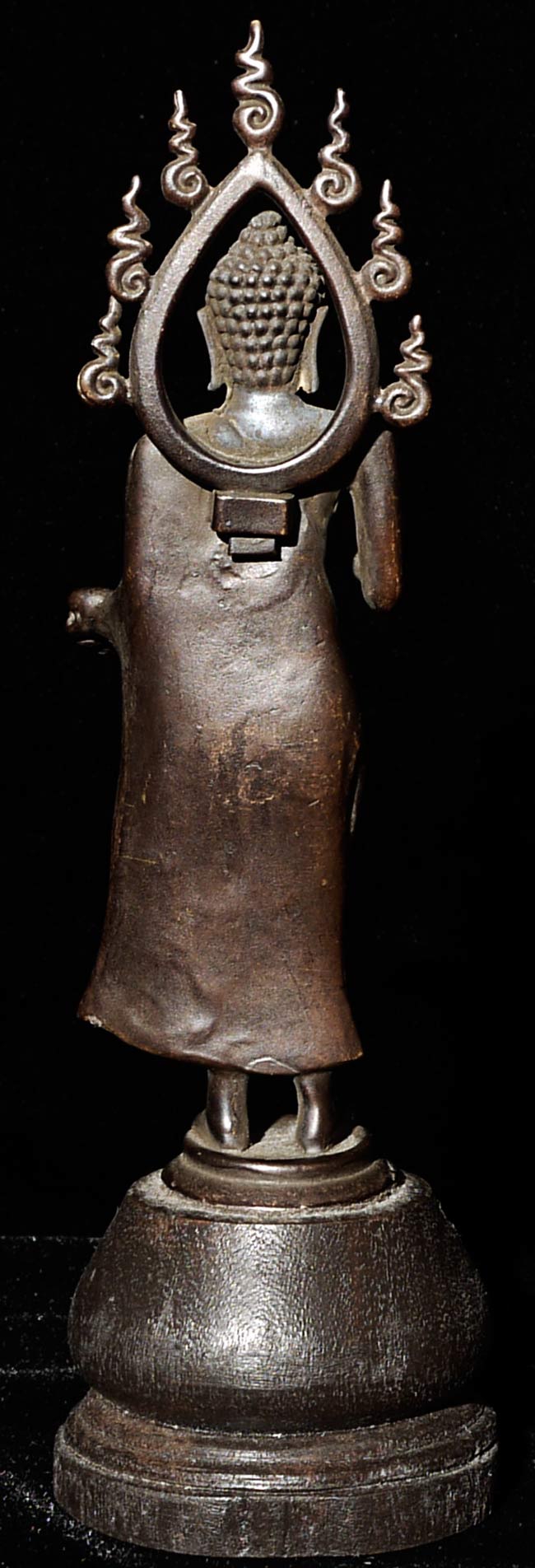 Fine miniature Thai Bronze Buddha. Sits 4" tall, wooden base is 1.25" tall, with a diameter of 1 5/8".